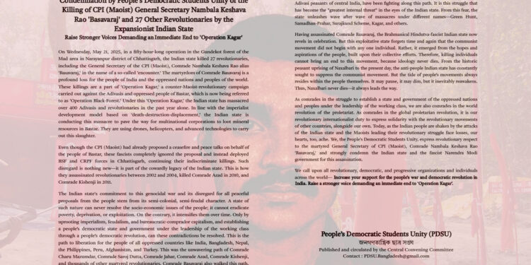 PDSU (Halkın Demokratik Öğrenci Birliği) ölümsüzleşen HKP (Maoist) Genel Sekreteri Basavaraj ve 27 Maoist hakkında bir açıklama yayımladı.