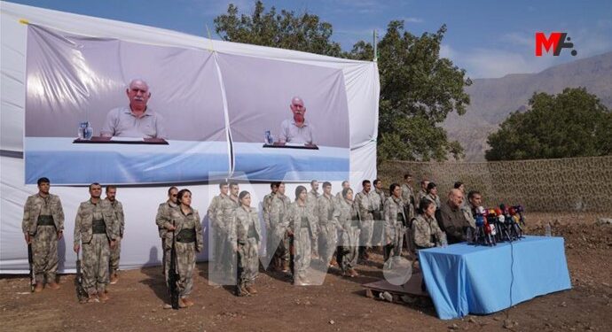 PKK yönetimi Barış ve Demokratik Toplum Süreci’ne dair Kandil’de önemli bir açıklama yaptı. Açıklamada, PKK 12’nci Kongre kararları kapsamında ve PKK Lideri Abdullah Öcalan’ın onayıyla Hêzên Parastina Gel (HPG) ve Yekîneyên Jinên Azad-Star (YJA-Star) gerillalarının “Medya Savunma Alanları”na geri çekilmeye başladığı aktarıldı. Karar kapsamında geri çekilen 25 HPG ve YJA-Star gerillası da yapılan açıklamaya katıldı.