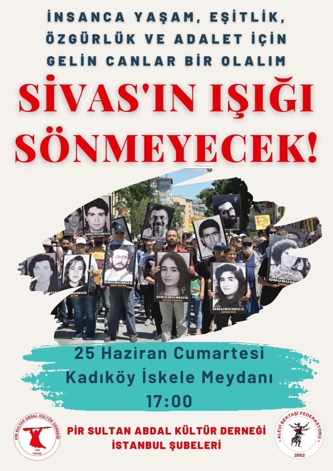 Pir Sultan Abdal Kültür Derneği (PSAKD) İstanbul Şubeler’in çağrısıyla bir araya gelinecek anma 25 Haziran Cumartesi günü saat 17.00’da Kadıköy Rıhtımda gerçekleştirilecek.