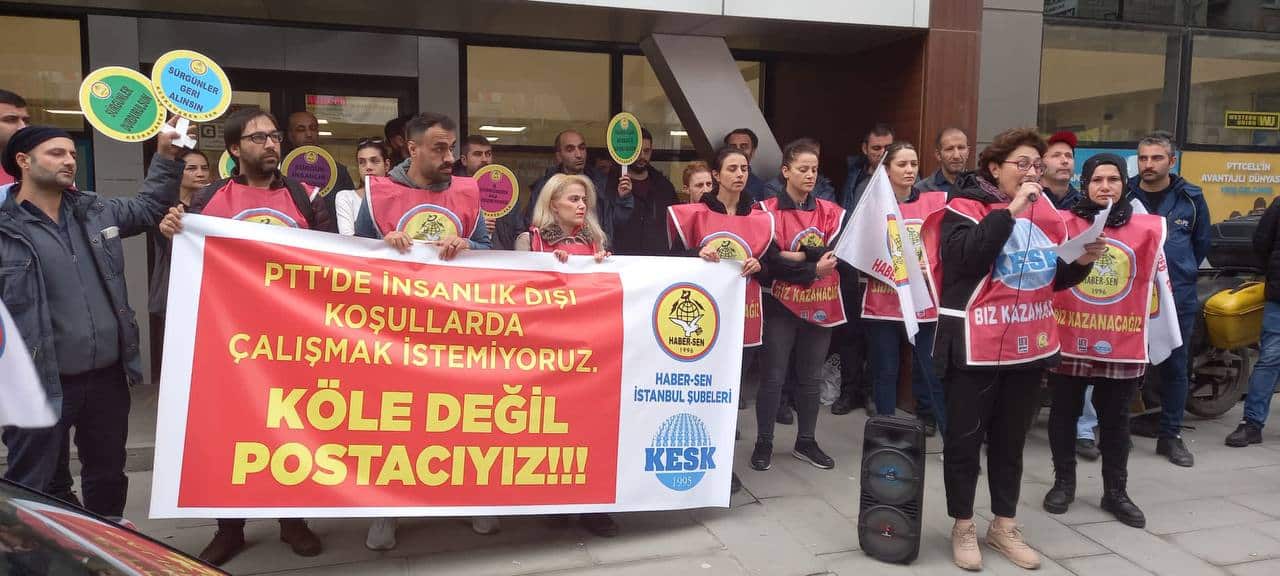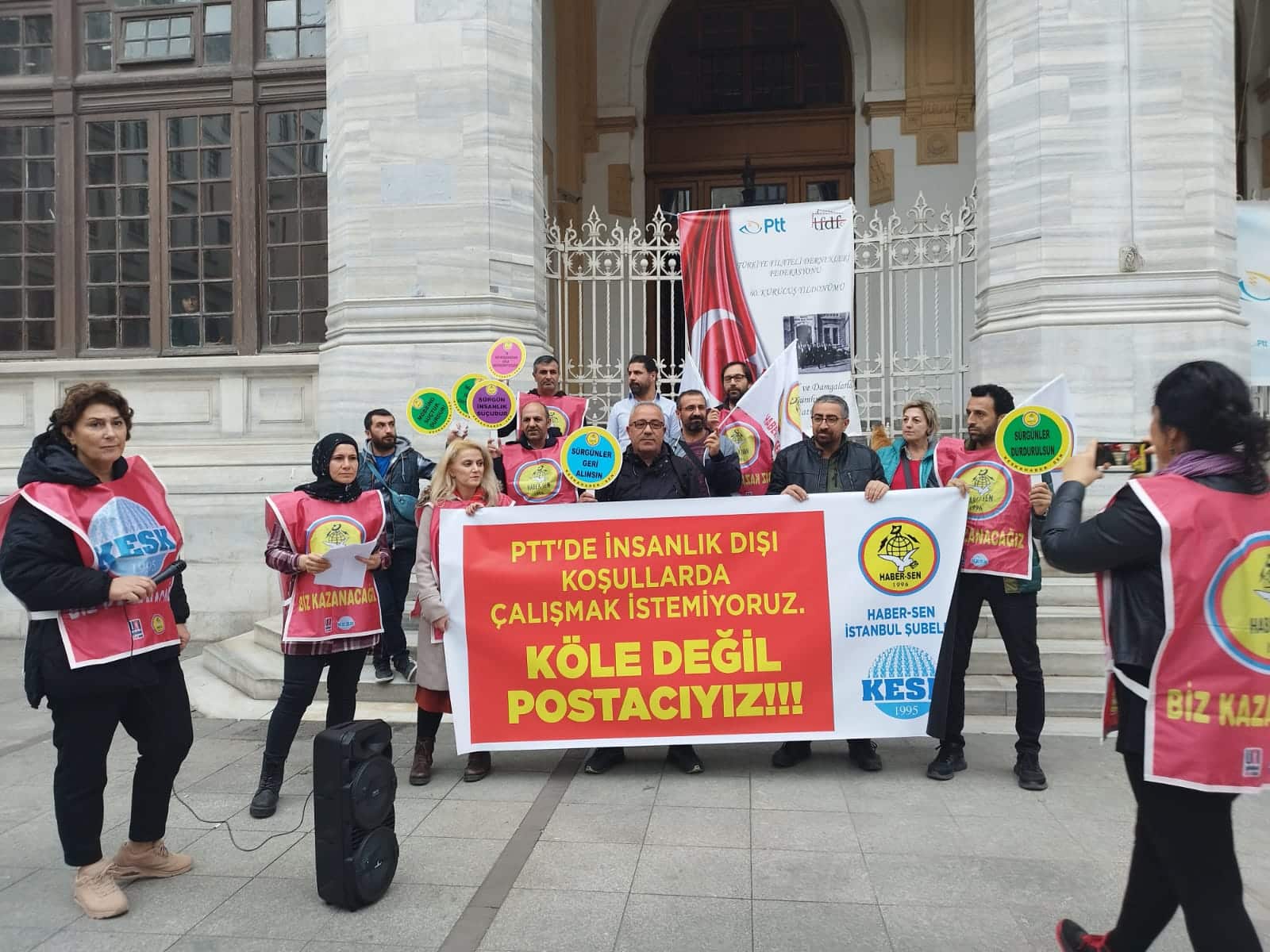 PTT’nin İstanbul Sirkeci binasında bir araya gelen PTT emekçileri “sömürü, baskı ve tehdit”lere karşı basın açıklaması gerçekleştirdi. Sirkeci’de basın açıklamasını okuyan Haber Sen 4 Nolu Şube Başkanı Gülseren Güngördü, “PTT’deki haksız, hukuksuz uygulamalar artık dayanılmaz seviyeye gelmiştir. Çok az sayıda personelle hizmet götürülmeye çalışılmıştır. 182. yıl önce kurulduğu günden itibaren bu kadar kötü şartlar ne görülmüş ne de duyulmuştur. Varlık Fonuna devredildikten sonra PTT zarara uğratılmış bir devlet kurumu halini almıştır. O gün bu gündür koskoca kuruma bir tane bile yeni personel alınmamıştır. Az personel ile her gün artan iş yükü yerine getirilmeye çalışılmaktadır.” dedi.