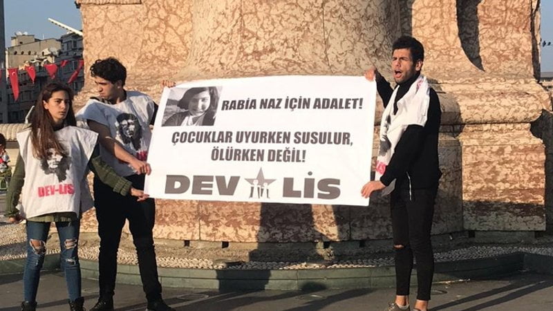 HABER MERKEZİ- Taksim Meydanı’nda bir araya gelen Devrimci Liseliler (Dev-Lis), Giresun’un Eynesil ilçesinde yaklaşık 1 yıl önce evinin önünde yaralı halde bulunduktan sonra kaldırıldığı hastanede yaşamını yitiren 11 yaşındaki Rabia Naz Vatan’ın şüpheli ölümüne ilişkin eylem yaptı.