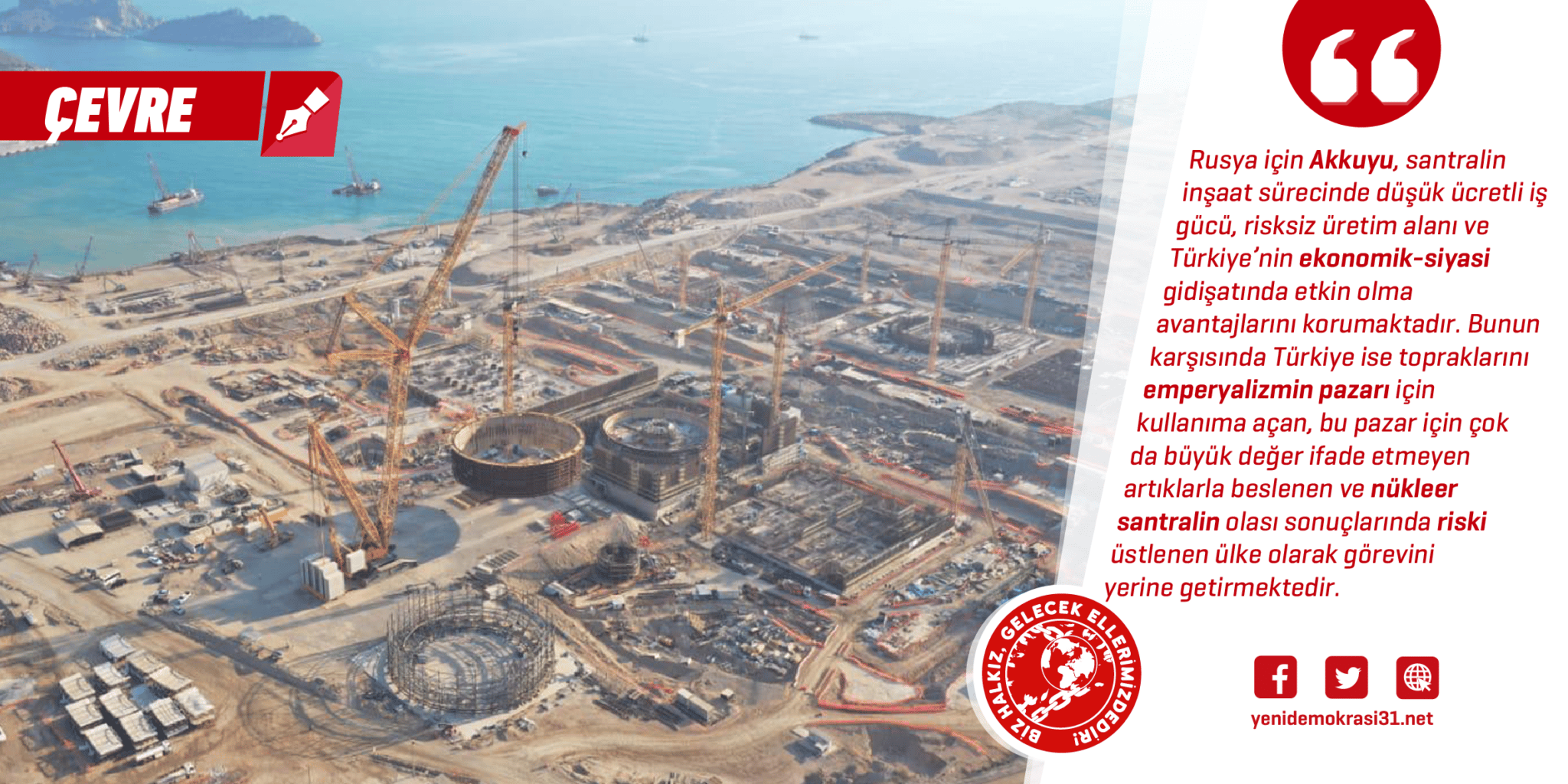 Akkuyu NGS’nin yaratacağı olası doğa tahribatı çokça tartışıldı. Bununla birlikte yakın zamanda Erzincan İliç’teki altın madeninde meydana gelen sızıntının yol açtığı çevre tahribatı da nükleer sızıntının sebep olacağı sonuçların ne denli ciddi boyutlarda varacağına dikkat çekti. Anlaşma gereği enerji çıktısının yönetiminde ve dağıtımında ciddi anlamda üstünlüğü olan ve karar mekanizmasında ağırlığı karşısında Türkiye, Rusya karşısında küçük bir pay ve büyük risk sahibi konumunda bulunmaktadır. Enerjinin kullanım haklarını elinde tutan Rusya için Akkuyu, santralin inşaat sürecinde düşük ücretli iş gücü, risksiz üretim alanı ve Türkiye’nin ekonomik-siyasi gidişatında etkin olma avantajlarını korumaktadır. Bunun karşısında Türkiye ise topraklarını emperyalizmin pazarı için kullanıma açan, bu pazar için çok da büyük değer ifade etmeyen artıklarla beslenen ve nükleer santralin olası sonuçlarında riski üstlenen ülke olarak görevini yerine getirmektedir. Yarı sömürge iktisadi yapının zorunluluğu, ülkeyi kuşatan emperyalist gücün ihtiyaçlarını karşılamaktır. Bugün kapitalist sistemin çıkmazları onun en yüksek aşaması emperyalizmi yarı sömürgeler üzerindeki etkinliğini artırmaya zorlamaktadır. Bunun sonucunda Türkiye, Amerikan emperyalizmi ve türevleriyle, bunun karşısında Rus emperyalizmiyle de sonuçta ABD’nin söz sahibi olduğu, olacağı bir ilişki kurmuş durumdadır. Emperyalistlerin çıkarlarını gerçekleştirmeye dayalı ve emperyalistler arası çatışmalarda ağır sonuçlar üretecek her ilişki gibi bu ilişki de halkın aleyhinedir. Bu ilişkilerdeki esas durum
