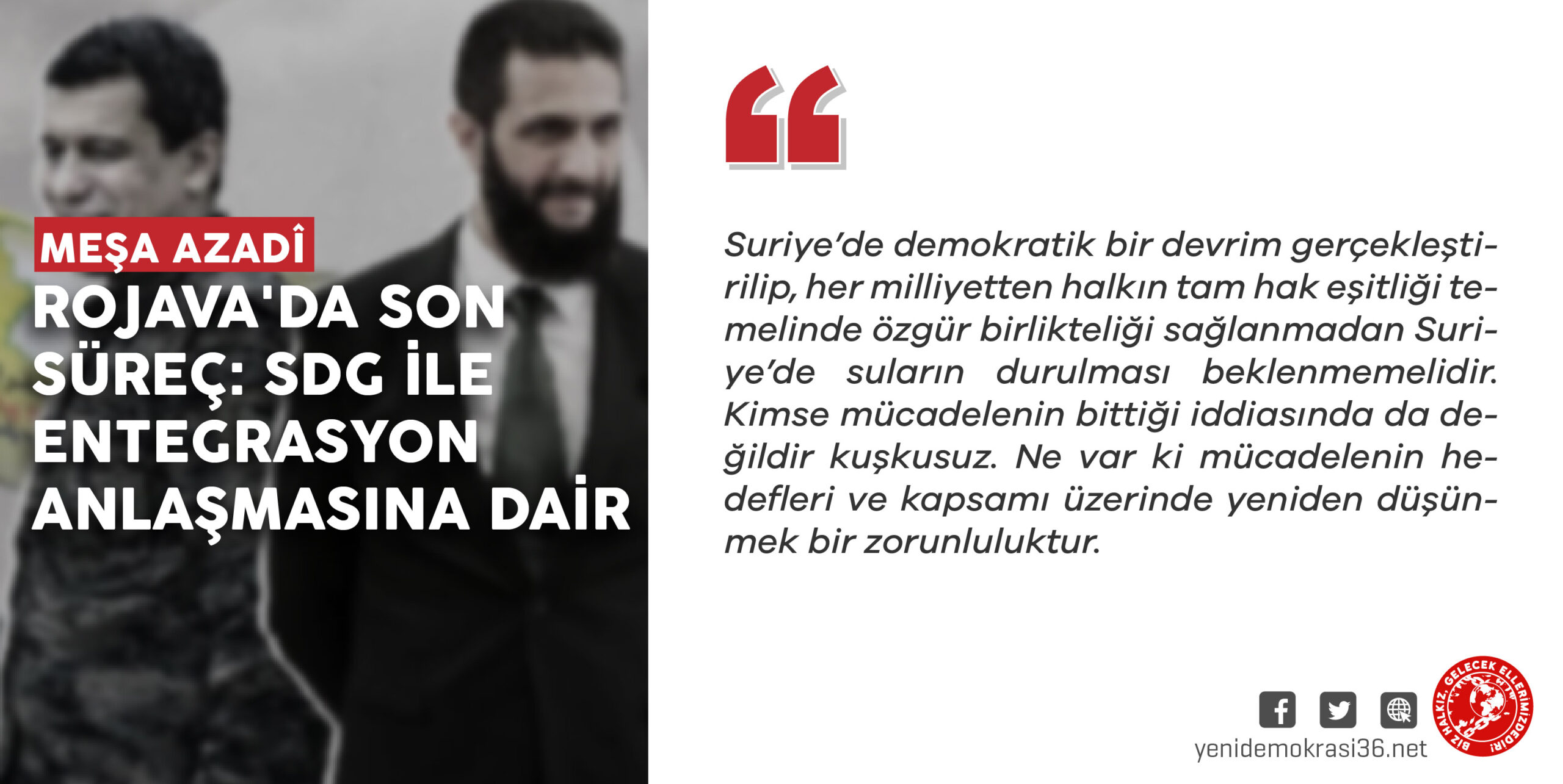 Suriye’de demokratik bir devrim gerçekleştirilip, her milliyetten halkın tam hak eşitliği temelinde özgür birlikteliği sağlanmadan Suriye’de suların durulması beklenmemelidir. Kimse mücadelenin bittiği iddiasında da değildir kuşkusuz. Ne var ki mücadelenin hedefleri ve kapsamı üzerinde yeniden düşünmek bir zorunluluktur.