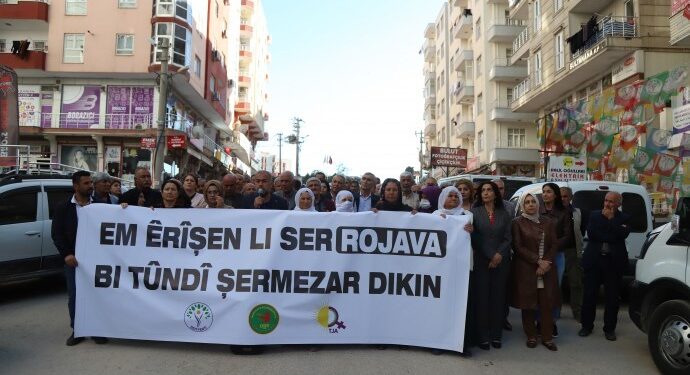 Batman’da DEM Parti, DBP ve TJA öncülüğünde açıklama yapıldı. Açıklamaya Batman Belediyesi Eş Başkanları Gülistan Sönük, Yeşil Işık, Barış Anneleri Meclisi, TUAY-DER, MEBYA DER ve çok sayıda yurttaş katıldı. Açıklamada “Kobanê Rûmeta Me Ye” pankartı açılırken sık sık, “Bijî Berxwedana Rojava”, “Direne direne kazanacağız” sloganları atıldı. Burada konuşan DBP Batman İl Örgütü Eş Başkanı Resul Çetin iktidarın uluslararası hukuku hiçe sayarak, saldırı gerçekleştirdiğini belirtti. Çetin, saldırıların derhal durması çağrısında bulundu.