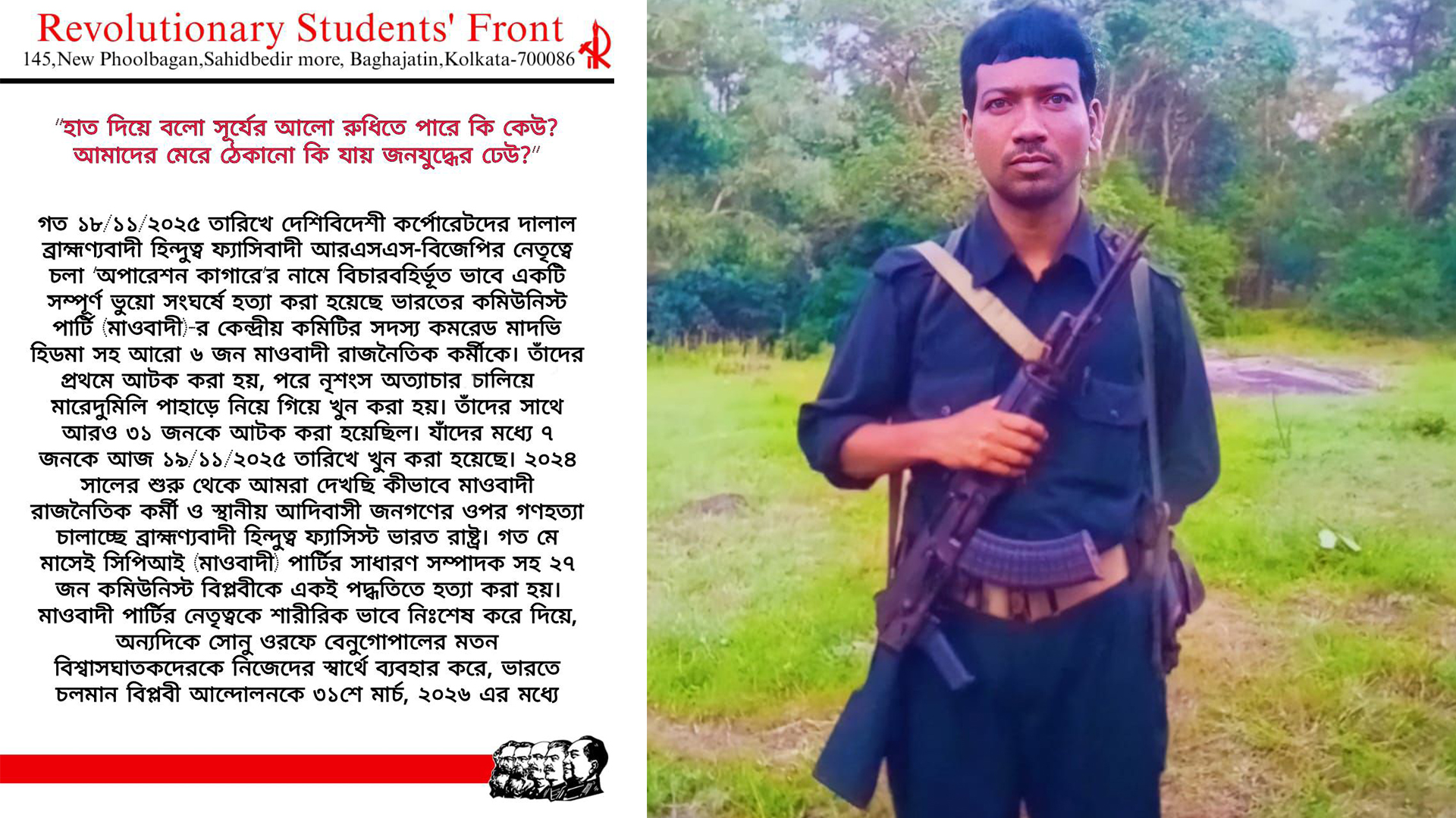 18/11/2025 tarihinde yerli-yabancı şirketlerin uşakları olan Brahmanik-Hindutva faşist RSS-BJP tarafından yürütülen “Kagar Operasyonu” adı altında, tamamen uydurma bir çatışma senaryosu yaratılarak Hindistan Komünist Partisi (Maoist) Merkez Komite üyesi yoldaş Madhavi Hidma ile birlikte 6 Maoist siyasî militan yargısız infazla katledildi.