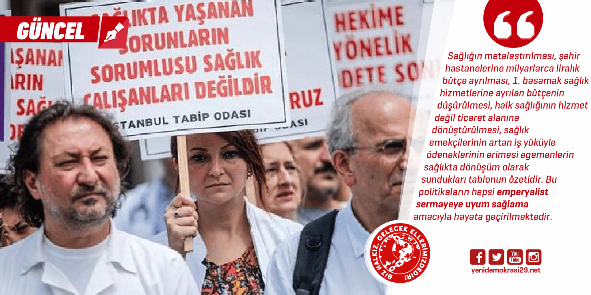 Sağlığın metalaştırılması, şehir hastanelerine milyarlarca liralık bütçe ayrılması, 1. basamak sağlık hizmetlerine ayrılan bütçenin düşürülmesi, halk sağlığının hizmet değil ticaret alanına dönüştürülmesi, sağlık emekçilerinin artan iş yüküyle ödeneklerinin erimesi egemenlerin sağlıkta dönüşüm olarak sundukları tablonun özetidir. Bu politikaların hepsi emperyalist sermayeye uyum sağlama amacıyla hayata geçirilmektedir. Egemenlerin derdi halk sağlığı değil buradan kazanacağı kârdır. Halk sağlığı sorunu sömürü ve kâr alanına dönüştürülmüştür.