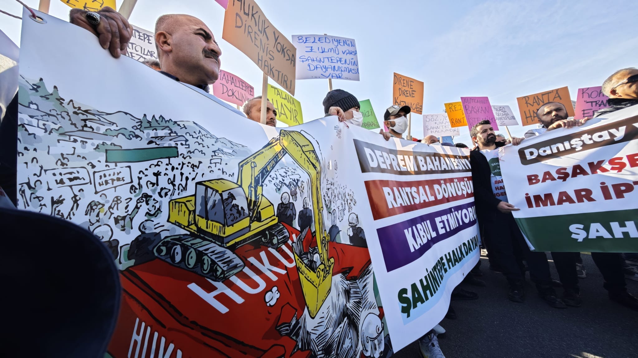 “Şahintepe Mahallesi, ‘rezerv alan yasası’ yani 6306 sayılı yasa yürürlüğe girdikten 5 ay sonra, 8 Eylül 2012’de Bakanlık oluru ile rezerv yapı alanı olarak kararlaştırıldı. 2012 yılında, 6306 sayılı yasa yürürlüğe girdiğinde rezerv yapı alanı tanımında ‘yeni yerleşim alanı olarak kullanılmak üzere’ ibaresi mevcuttu. Mahallemiz, üzerinde yaşayan 10 binlerce insana rağmen, yerleşim alanı sayılmayarak rezerv alan ilan edildi. Bu karara göre bakanlığın bu dönüşüm sürecinde olağanüstü yetkileri vardır. Bakanlık ise bu yetkileri, örneğin; polis zoruyla sabahın köründe ev yıkma yetkisini belediyeyle paylaşmaktadır. Belediye ise bunu Başakkent AŞ ile… Böylece zincirleme şekilde mahallemize saldırmaktadırlar.”