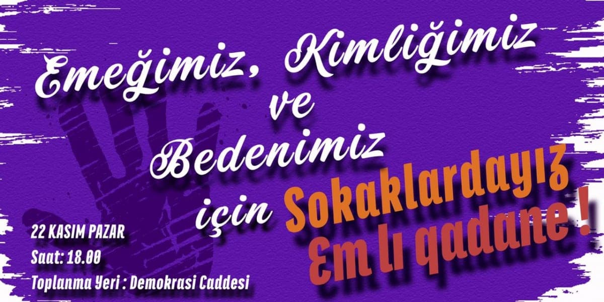 “Emeğimiz, kimliğimiz ve bedenimiz için sokaklardayız-em lı qadane” diyen kadınlar, 22 Kasım Pazar günü Sarıgazi Demokrasi Caddesi’nde bir araya gelecekler. Aralarında Yeni Demokrat Kadın’ın da olduğu kadın örgütleri, 22 Kasım’da Sarıgazi’de, 25 Kasım’da Kadıköy’de düzenlenecek eylemlerin çalışmalarını sürdürüyor.