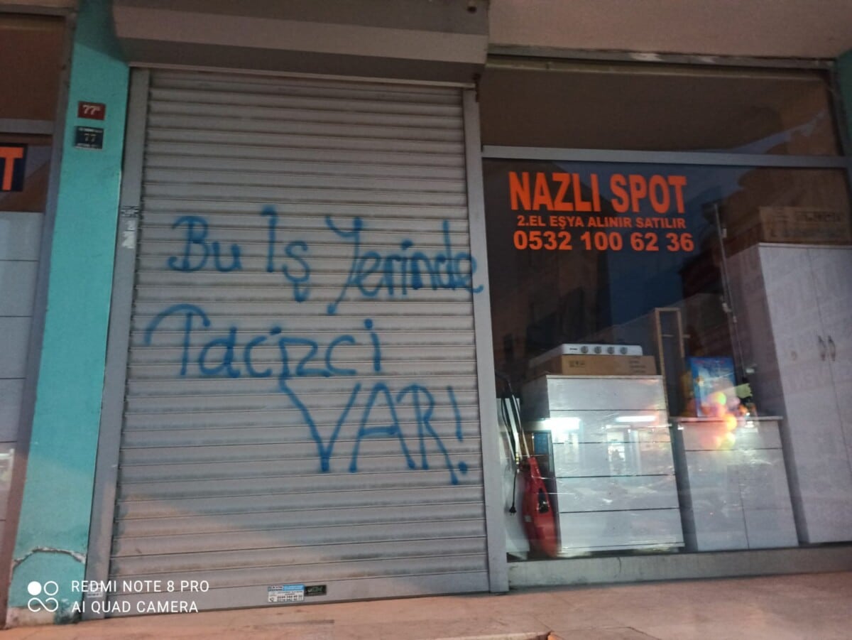 Esnafın dükkanına yazılamalar yapılarak, dükkan önünde konuşmalar gerçekleştirildi. “Bizler bu tacizciden hesap sormak için buluştuk” diyen kadınlar “Kadınlar sokağa hesap sormaya” sloganlarını atıldı.