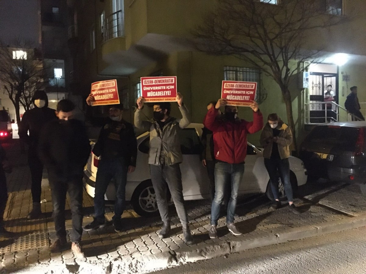 Sık sık “Kayyum rektör istemiyoruz”, “Faşizme karşı omuz omuza”, “Kurtuluş yok tek başına, ya hep beraber ya hiç birimiz” sloganlarının atıldığı yürüyüşte Yeni Demokrat Gençlik de “Özerk-Demokratik Üniversite için Mücadeleye” yazılı dövizler taşıdı. Ajitasyonlar çekilerek, özelde halk gençliğine ve topyekün tüm halk kitlelerine yönelik saldırılara karşı birlik ve mücadele çağrısı yapıldı. Yürüyüş boyunca halk da balkon ve pencerelerinden alkış ve sloganlarla destek verdi.