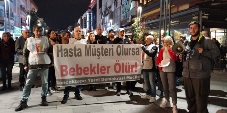 Sancaktepe Yerel Demokrasi Meclisi’nin çağrısıyla bugün Demokrasi Caddesi’nin başında kamuoyunda “yenidoğan çetesi” olarak bilinen olaya karşı bir araya gelenler “Hasta Müşteri Olursa Bebekler Ölür” yazılı pankart taşıyarak açıklama yaptı.