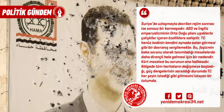 Suriye’de uzlaşmayla devrilen rejim sonrası ise sonsuz bir karmaşadır. ABD ve İngiliz emperyalizminin Orta Doğu planı uşaklarla çelişkiler içeren özelliklere sahiptir. TC henüz kedinin kendini aynada aslan görmesi gibi bir davranış sergilemekte. Bu, faşizmin beka sorunu olarak tanımladığı meselelerde daha dirençli hale gelmesi için bir nedendir. Kürt meselesi bu sorunun ana halkasıdır. Bölgede tüm haritaların değişmeye başladığı, güç dengelerinin sarsıldığı durumda TC her şeyin istediği gibi gitmesini isteyen bir tutumda.