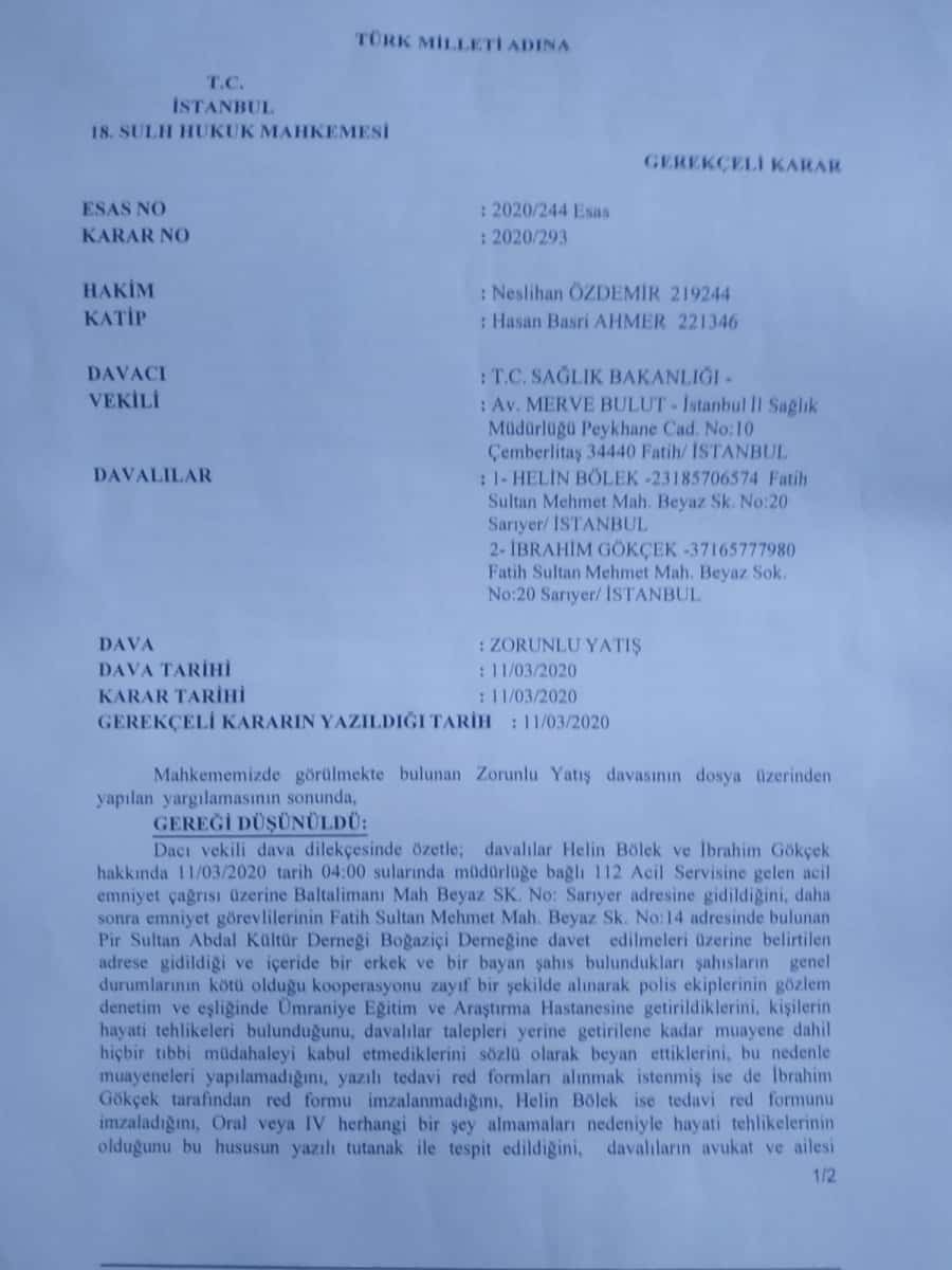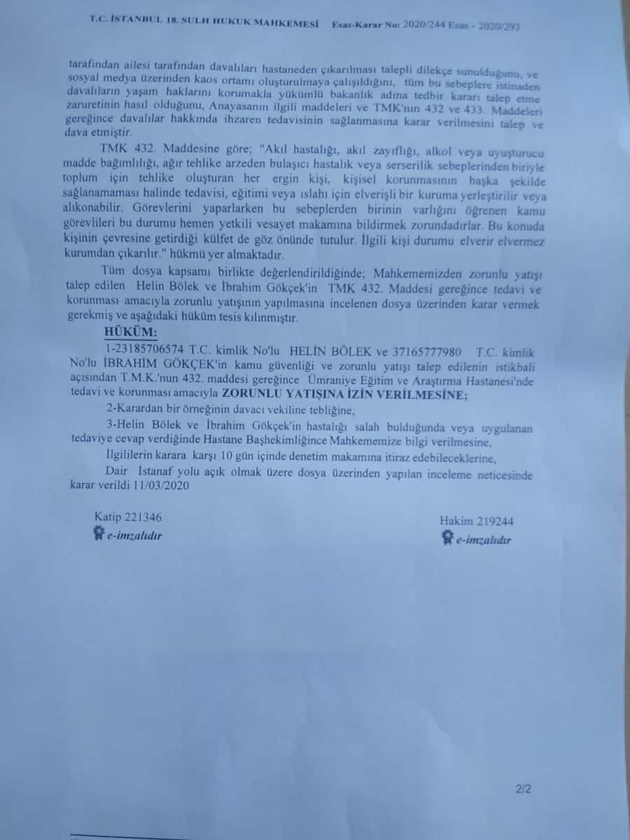• Mahkemenin kararı incelendiğinde; kimin tarafından yapıldığı anlaşılmayan dış gözleme dayalı bir metnin dava dilekçesi olarak sunulduğu, dava dilekçesinin içeriğinde bilimsel bir dayanağı olmayan genel bir gözlemin ve müvekkillerin tavrına dair anlatımın yer aldığı, sonuç kısmında sosyal medya üzerinden kaos ortamı oluşturulmaya çalışıldığı şeklinde bir suçlama ve davalıların yaşam haklarını korumakla yükümlü bakanlık adına tedbi̇ren karar verilmesinin talep edildiği, Hükmün ise TMK’nın 432. maddesi atfı ile kamu güvenli̇ği̇ ve zorunlu yatışı talep edi̇leni̇n i̇sti̇kbali̇ açısından zorunlu yatışa izin verilmesi gerektiği şeklinde kurulduğu görülmektedir.