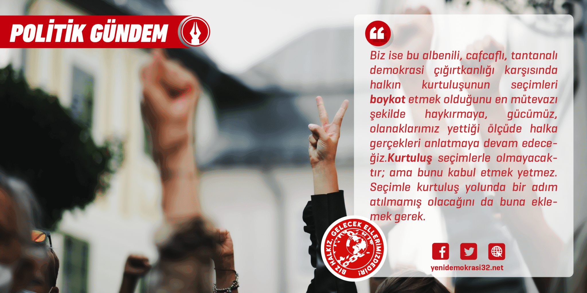 Biz ise bu albenili, cafcaflı, tantanalı demokrasi çığırtkanlığı karşısında halkın kurtuluşunun seçimleri boykot etmek olduğunu en sade, en mütevazı şekilde haykırmaya, gücümüz, olanaklarımız yettiği ölçüde halka gerçekleri anlatmaya devam edeceğiz. Kurtuluş seçimlerle olmayacaktır; ama bunu kabul etmek yetmez. Seçimle kurtuluş yolunda bir adım atılmamış olacağını da buna eklemek gerek.