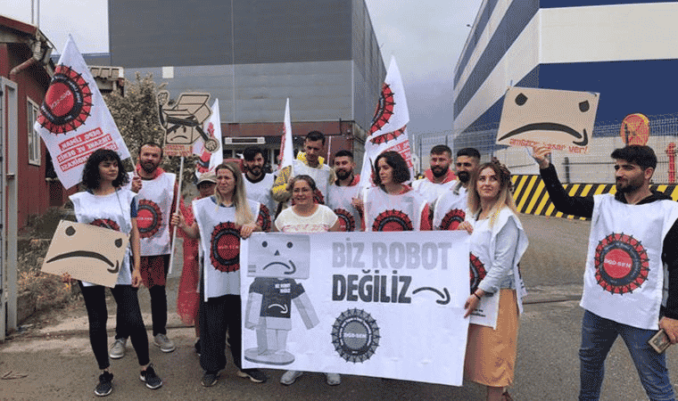 Öte yandan depo önünde konuşan DGD-Sen Genel Başkanı Neslihan Acar, “Zorla X-ray cihazlarından geçirdiğiniz işçilerin, ağır kolilerle düşüklere neden olduğunuz kadınların, yine yıllardır bozuk yemekleri dayattığınız işçilerin öfkesiyle geldik biz buraya. Anayasal hakları olan sendikaya üye olmak istedikleri için işten atılan işçiler için buradayız” dedi.