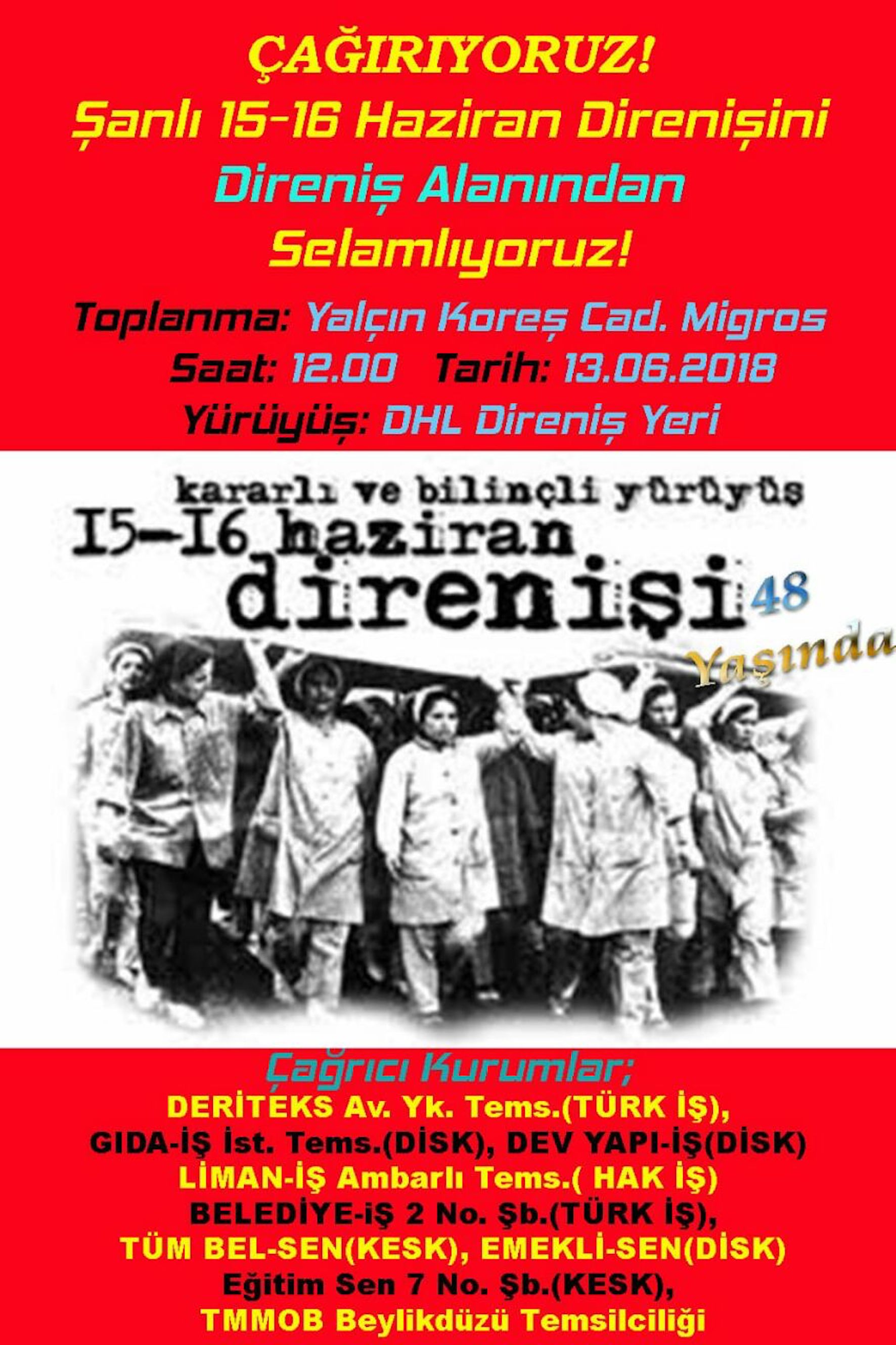 HABER MERKEZİ- 15-16 Haziran işçi direnişinin 48. yılında Deriteks Avrupa Yakası Temsilciliği (Türk-İş), Gıda İş İstanbul temsilciliği (DİSK), Dev Yapı-İş (DİSK), Liman İş Ambarlı Temsilciliği (Hak-İş), Belediye İş 2 Nolu Şube (Türk-İş), Tüm Bel-Sen (KESK), Emekli-Sen (DİSK), Eğitim Sen 7 Nolu Şube (KESK), TMMOB Beylikdüzü Temsilciliği DHL Express işçilerinin direnişini ziyaret çağrısında bulundu.