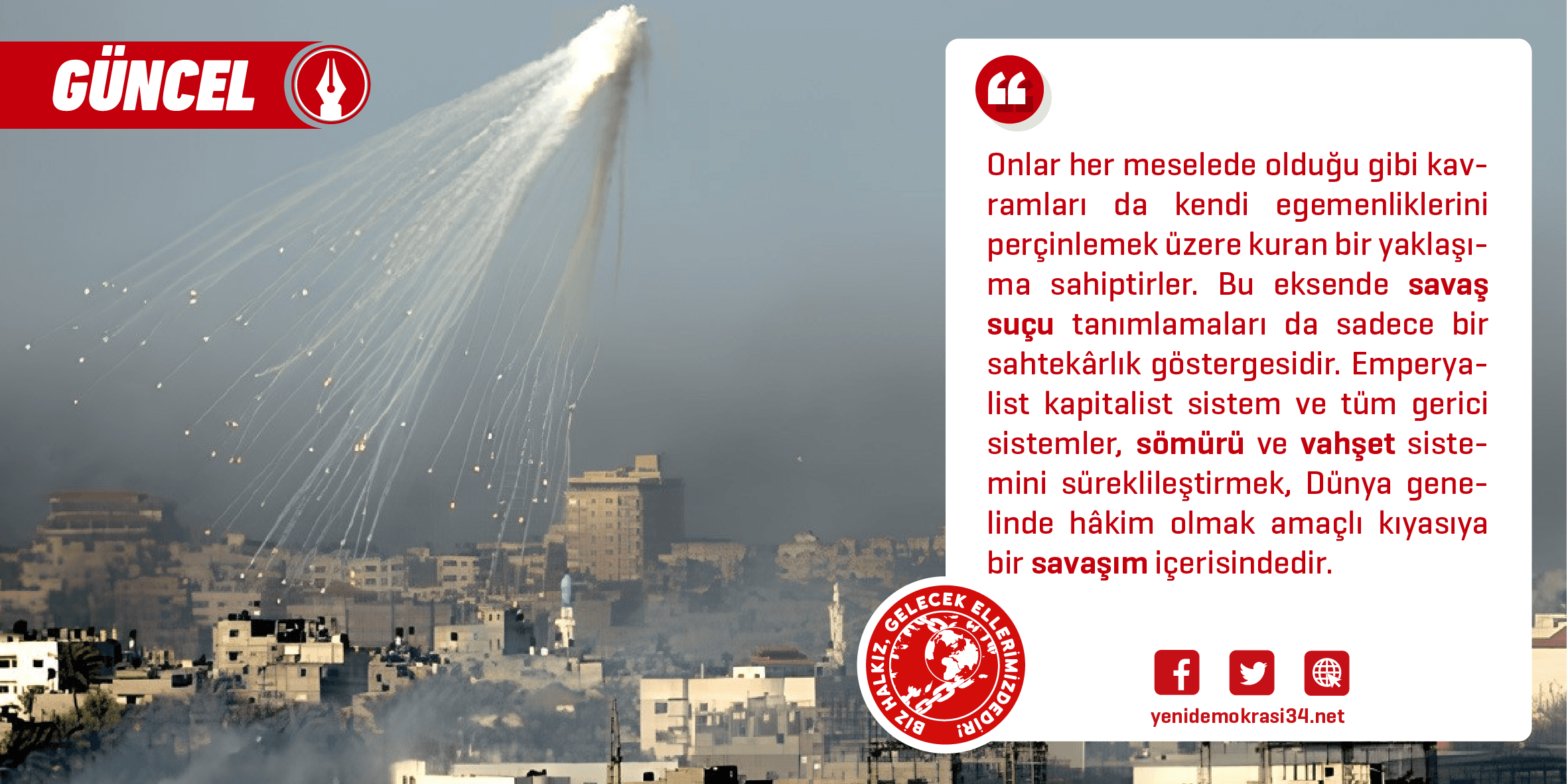 Bugün İsrail’in Gazze’deki tüm yaşamı yok etmeye yönelen saldırganlığı karşısında “savaş suçu” kavramına sarılan egemenlerin benzer suçlara birçok kez bulaştıkları, bu suçların sicillerinde kayıtlı olduğu unutulmamalıdır. Onların İsrail’in özelde Filistin halkında ama genelde bölge halklarına karşı işlediği suçlardan, bu saldırıda ölen çocuklardan, kadınlardan, yok edilmeye çalışılan Filistin davasından daha çok bölgede güttüğü hesaplar vardır. Örneğin savaş suçu ve uluslararası mahkemede yargılama yaygarası yapan TC, Kürt katliamları nedeniyle İsrail için işaret ettiği Roma Statüsü’ne taraf bile değildir. Filistin’de yaşanan katliamdan çok bölgede daha etkin rolü hangi politik konumlanmayla elde edeceği peşindedir. Bu, tüm gerici güçler için geçerlidir.