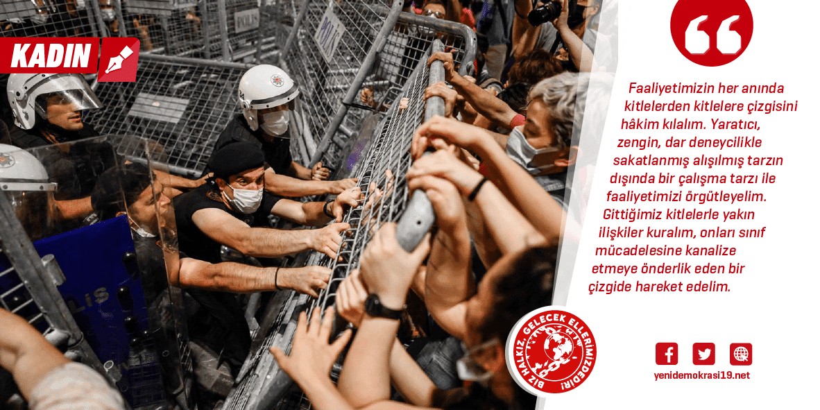 Bu anlayışla temel hedefi kitlelerle buluşmak olan “Şiddeti Üreten Devlet Şiddeti Yok Edemez” şiarlı çalışmamız boyunca devletin ve bir bütün hâkim sınıf sözcülerinin kadına yönelik şiddetle mücadele adı altında sergiledikleri ikiyüzlü politika teşhir edilmeli, her türlü karşı devrimci ve haksız şiddetin üstünü örterek kadına şiddeti meşrulaştırmaya çalışan siteme karşı devrimci çizgide örgütlü mücadele propagandası yapılmalıdır. Hâkim sınıf sözcülerinin “kadına uygulanan şiddet tolere edilebilir.” diyerek kadına yönelik şiddetle mücadelede kadının yanında olmadıkları/olmayacakları, Diyanetin kadınlara verdiği öğütlerin içinde kölelik, biat nutukları ile şiddetle mücadelede erkek egemen zihniyeti nasıl ürettikleri, Ensar Vakfı’nda tecavüze uğrayan çocuklara “Bir kereden bir şey olmaz.” diyerek şiddetle mücadelede tecavüzcülere cesaret verdikleri, defalarca korunma talebinde bulunan kadınların katledilmesine göz yumulması ve katillerinin aklanması ile yargının erkek egemen niteliği, Devletin Avrupa Birliği Konseyi Sözleşmesi olan ve İstanbul Sözleşmesi olarak bilinen “Kadına yönelik şiddetin ve ev içi şiddetin önlenmesi” sözleşmesinin feshedilmesi, 4. yargı paketinde yer alan çocuğun cinsel istismarında “kuvvetli suç şüphesi” yerine “somut delil” arayarak ve çocuk tecavüzlerinin üstünü kapatarak şiddetle nasıl mücadelede etmediği ve etmeyeceği kitle çalışmalarımızda anlatılmalıdır. İktidarı, muhalefeti ile egemen sınıfların partilerinin ikiyüzlü karakteri ortaya konmalı, bunlar arasında seçim yapmak zorunda olmayan emekçi kadınların mücadele etmekten başka bir yolu olmadığı anlatılmalıdır.