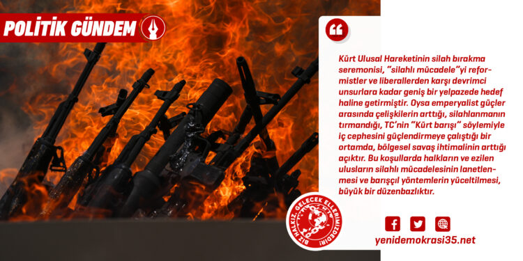 Kürt Ulusal Hareketinin silah bırakma seremonisi, “silahlı mücadele”yi reformistler ve liberallerden karşı devrimci unsurlara kadar geniş bir yelpazede hedef haline getirmiştir. Oysa emperyalist güçler arasında çelişkilerin arttığı, silahlanmanın tırmandığı, TC’nin “Kürt barışı” söylemiyle iç cephesini güçlendirmeye çalıştığı bir ortamda, bölgesel savaş ihtimalinin arttığı açıktır. Bu koşullarda halkların ve ezilen ulusların silahlı mücadelesinin lanetlenmesi ve barışçıl yöntemlerin yüceltilmesi, büyük bir düzenbazlıktır.