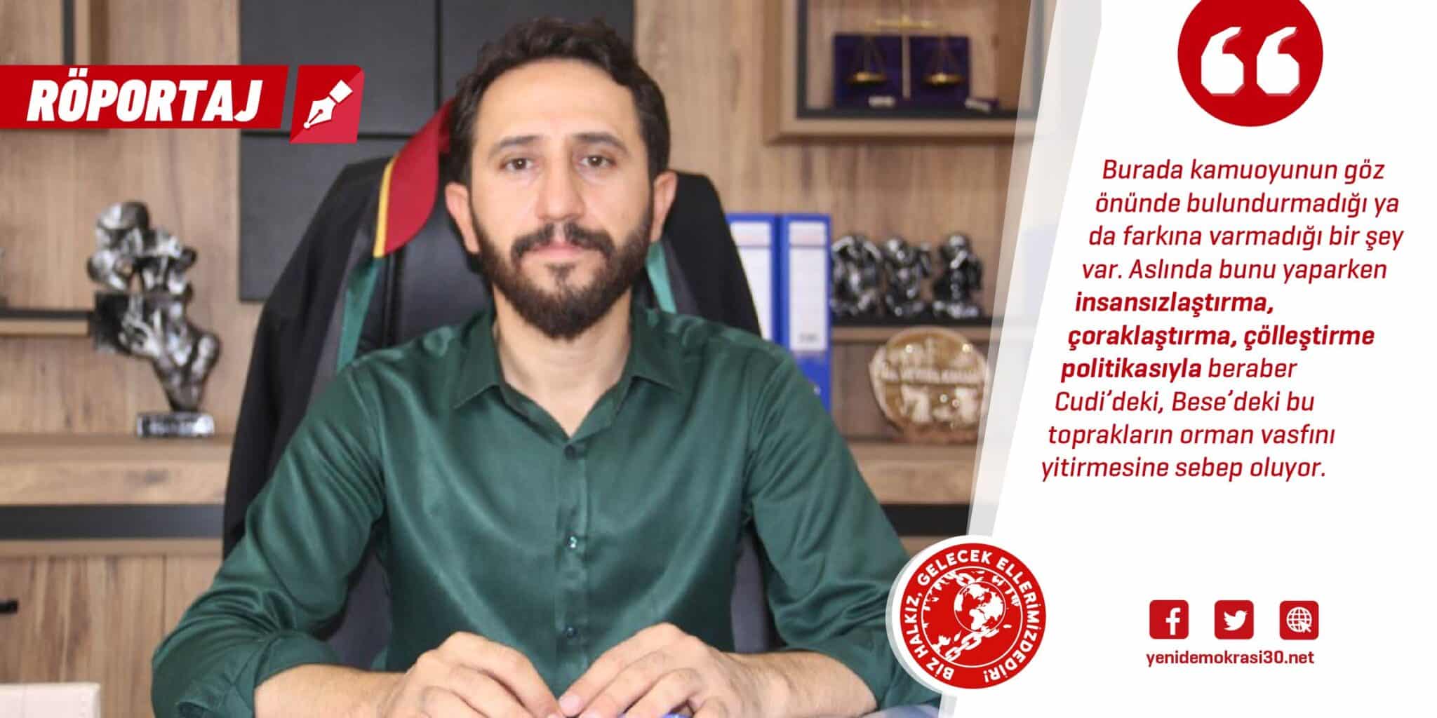 Burada kamuoyunun göz önünde bulundurmadığı ya da farkına varmadığı bir şey var. Aslında bunu yaparken insansızlaştırma, çoraklaştırma, çölleştirme politikasıyla beraber Cudi’deki, Bese’deki bu toprakların orman vasfını yitirmesine sebep oluyor. Bununla beraber aslında ne yapılıyor: Kömür alanlarına bakir bir şekilde alan açılıyor. Öncelikle şunu söyleyebiliriz: 2 yıldır bu çıkarılan kömürler asfalt kömür tipidir. Türkiye’de sadece Şırnak’ta çıkarılıyor. Kalorisi yüksek bir kömürdür. Bu çıkarılan kömür kısa yolla Cizre-Silopi üzerinden tekrardan Ciner Grubuna Silopi-Görümlü’deki termik santrale taşınıyor. Aslında 2 ay kapalı kaldı kömür madeni. Çünkü şehir dışından gelen kömür tırı inanılmaz maliyetliydi. Çünkü Rusya-Ukrayna savaşından sonra petrol fiyatları yükseldi. Bu yüzden “bir taşla üç kuş” vuruyorsunuz. Burada güvenlik bahanesiyle insanları telkin ediyorsunuz: “Biz bunlar güvenlik nedeniyle yapıyoruz” deniliyor. Buradaki milliyetçi kesimi teskin ediyorlar. İkincisi ise orada ormanlık alanlar inanılmaz büyük meblağlar içeriyor. Belki şu an günlük 30-40 araç çıktı. Her bir aracın maliyeti yaklaşık 40-50 bin liradır. Yani şu an günlük yaklaşık 2 trilyon liraya denk geliyor. Bunu aylara, yıllara vurursanız ciddi bir para ortaya çıkıyor. Bu pastadan hem para kazanmış oluyorsunuz hem kömür almış alıyorsunuz. Aynı zamanda oradaki yabani hayvanları (yaban keçisi, ceylan, tavşan, keklik vs.) endemik ve değerli hayvanları avlıyorlar. Hayvanları doğal yaşamlarını da yok etmiş oluyorsunuz. Sonuç olarak bir hareket ile kendilerine dört “fayda” sağlamış oluyorlar. Bunu yaparken de kamuoyunun sessizliği, kamu baskının az olması da var. Yaklaşık birkaç aydır hareketlenme var Türkiye’de. Kamu yeni yeni bulgular olduğunu görüyor. Bundan rahatsızlar. Şu anki biz Şırnak Barosu Çevre ve Kent Komisyonu olarak, bir sivil toplum kuruluşu olarak, yapabileceğimiz şeyler aslında kamu baskısını artırmaktır. Biz başvurularımız yaptık ancak ne kadar bu başvurularımız değerlendirilir bilinmez. Şu an hukuk çok da güvenli bir durumda değil. Dediğimiz gibi bu süreç devam ediyor. Raporlama çalışmamız devam ediyor. Aynı zamanda sanal medyada Şırnak Ekoloji Platformu adı altında kurumlarla buluştuk. Bu kurumlar: Şırnak Barosu, Kamu Emekçileri Sendikaları Konfederasyonu (KESK), Türk Mühendis ve Mimar Odaları Birliği (TMMOB), Cizre Bisiklet ve Doğa Derneği, Özgürlük İçin Hukukçular Derneği (ÖHD), Şırnak Tabip Odası, İnsan Hakları Derneği (İHD) var. Bu platformla aktif bir şekilde müdahalelerimiz devam ediyor. Bizim yapmamız gereken şu: Bu kamu baskısını maksimum düzeye çıkarmak. Bu olduğu zaman geriye doğru bir yavaşlama olabilir. Çünkü insanlar o zaman “ağacım kesilmeyebilir”, “bir şeyler yapabiliriz” diyerek bir cesaret getirir. Biz bu sürecin takipçisi olmaya devam edeceğiz. Bu bizim için insani ve vicdani bir sorumluluktur.