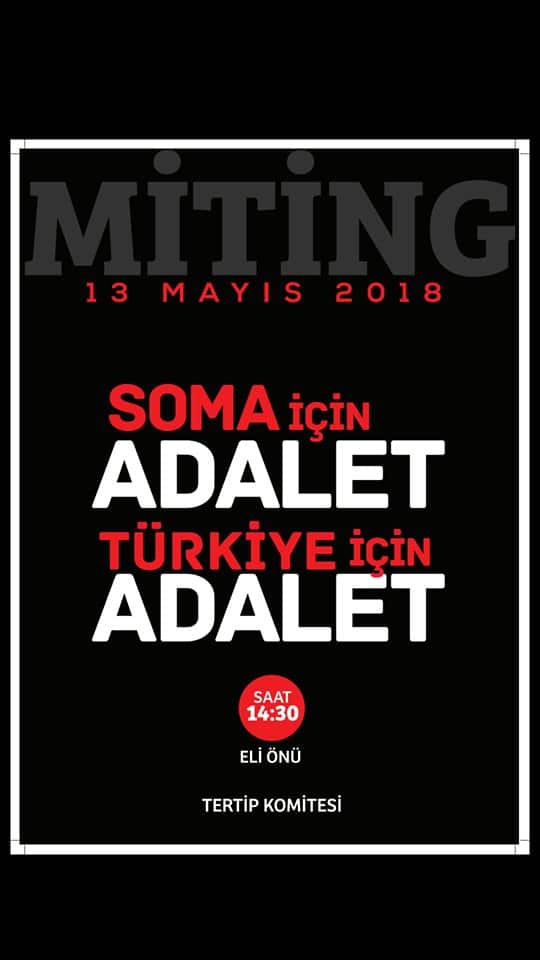 HABER MERKEZİ- Bundan tam 4 yıl önce Soma’da göz göre göre katledilen 301+ maden işçisi için açılan davalar hala devam etmekte. Hukuk alanında haklı davalarının takipçileri olan aileler 13 Mayıs Pazar günü Soma TKİ Ege Linyitleri İşletmesi önünde yapılacak olan mitinge destek çağrısı yaptı.