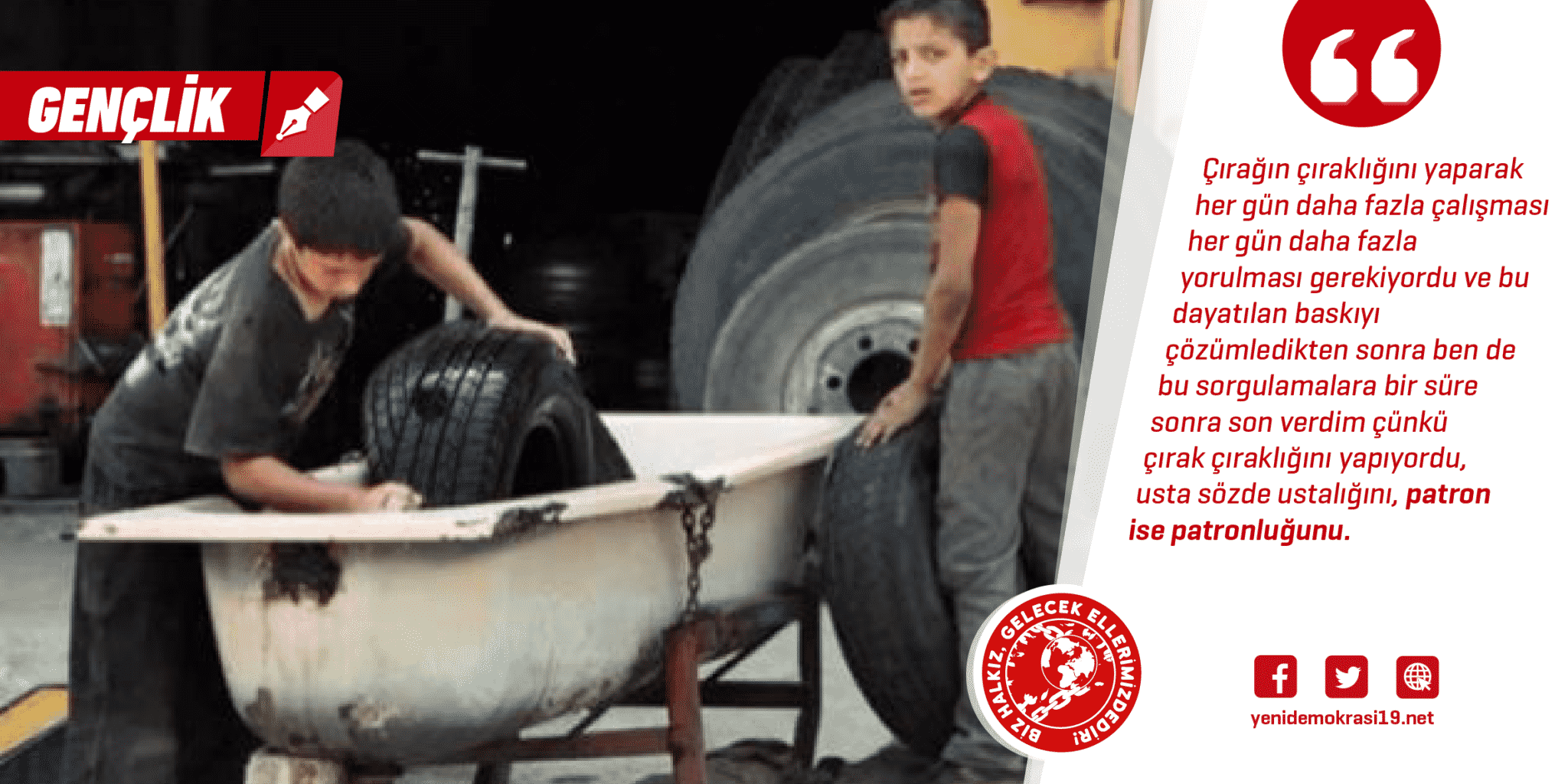 Çırağın çıraklığını yaparak her gün daha fazla çalışması her gün daha fazla yorulması gerekiyordu ve bu dayatılan baskıyı çözümledikten sonra ben de bu sorgulamalara bir süre sonra son verdim çünkü çırak çıraklığını yapıyordu, usta sözde ustalığını, patron ise patronluğunu. Hiçbir koşul hiçbir gerekçe bunları değiştirmiyor. Patron her yerde patrondur. Benimde kuzenim olması samimi olmam beni sevmesi gerekçeleri bunu değiştirmedi benim için patron hep patrondu. Tüm bunların yanı sıra, rahatsız edici koşullarda çalışmanın bana kazandırmış olduğu bir deneyim de oldu. O da işçi gençliğinin sorunlarını daha yakından hissetmem ve bu sorunlara dair bir şeyler yapmanın sorumluluğu oldu.
