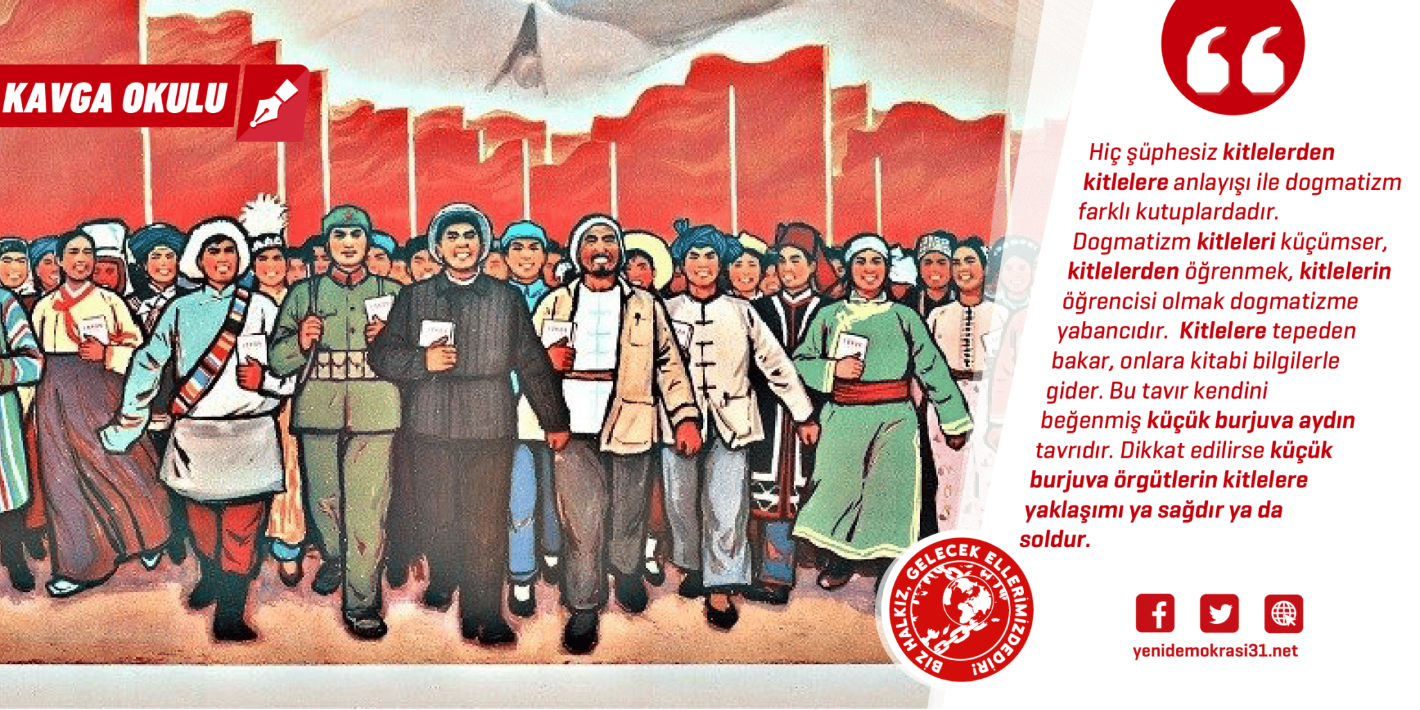 Hiç şüphesiz kitlelerden kitlelere anlayışı ile dogmatizm farklı kutuplardadır. Dogmatizm kitleleri küçümser, kitlelerden öğrenmek, kitlelerin öğrencisi olmak dogmatizme yabancıdır. Kitlelere tepeden bakar, onlara kitabi bilgilerle gider. Bu tavır kendini beğenmiş küçük burjuva aydın tavrıdır. Dikkat edilirse küçük burjuva örgütlerin kitlelere yaklaşımı ya sağdır ya da soldur. PP içinde de kitlelere karşı sol yaklaşıma tanık olmuşluğumuz vardır. Bunlar PP’de dogmatizm ve sekterlik olarak açığa çıkan burjuvaziye ait pratiklerdir.