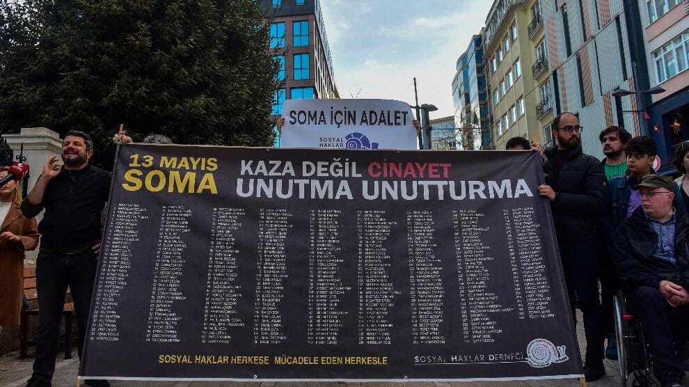 Konuşmaların ardından Sosyal Haklar Derneği adına açıklamayı Soma davası avukatlarından Evren İşler okudu. 301 işçinin hayatını kaybettiği, 162 işçinin ise yaralandığı ve tarihin en büyük işçi katliamlarından birisi olan Soma Katliamı için görülen davasında sanıkların adeta aklandığını belirten Evren, süreci şöyle anlattı: “ Yargıtay 12. Ceza Dairesi, daha önce oybirliği ile verdiği 30.09.2020 tarihli kararı ile, öldürülen işçilerin olası kasıt ile öldürüldüğünü vurgulamış ve patron Can Gürkan’ın olası kastla insan öldürme suçundan 301 kez ayrı ayrı cezalandırılması gerektiğine hükmetmişti. Bunun üzerine Yargıtay 12. Ceza Dairesi’nin üç üyesi değiştirilerek, yerlerine getirilen üç yeni üyenin çoğunluk kararı ile bu tarihi karar bozuldu ve dosya tekrar ilk derece mahkemesine gönderilerek sanıkların bilinçli taksir hükümleri uyarınca cezalandırılması sağlandı. Yargıtay 12. Ceza Dairesi tarafından verilen bu son karar ile de, patron Can Gürkan hakkında verilen ve ‘neredeyse yatarı dahi olmayan’’ hapis cezası kesinleştirildi. Bugün bu dosya için özel olarak görevlendirilmiş olan üç üye hakim tarafından verilmiş olan bu karar, iş cinayetlerine dair yargısal içtihadın ve işçi sınıfı tarihin açısından en ileri yargı kararlarından birisinin gasp edilmesi demektir.”