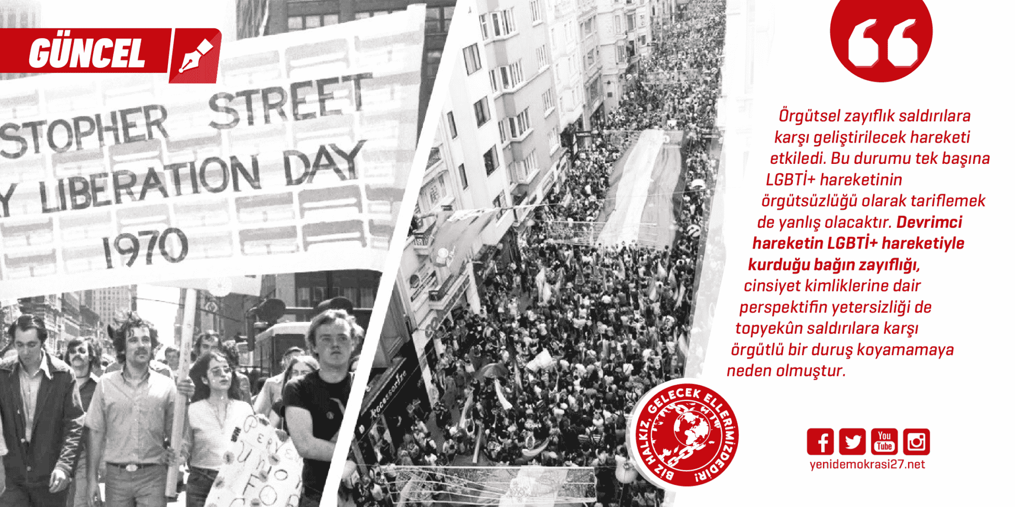 Devrimci hareketin LGBTİ+ hareketiyle kurduğu bağın zayıflığı, cinsiyet kimliklerine dair perspektifin yetersizliği de topyekûn saldırılara karşı örgütlü bir duruş koyamamaya neden olmuştur. Bir yandan LGBTİ+ hareketine yedeklenme diğer yandan LGBTİ+ olmayı “emperyalizmin oyunu”, “hastalık” olarak nitelendirme, hareketin devrimci örgütlere bakışını değiştirmiştir. Türkiye Devrimci Hareketi sağ ve sol savrulmalarla kimlik siyasetini devrim mücadelesinde bir yere oturtamamıştır. Devrimci örgütler içinde de kendini var etme sorunu yaşayan LGBTİ+’lar son dönemlerde propagandası daha güçlü yapılan “örgütsüzlüğe” doğru yönelmişlerdir. Örgütsüzlük yalnızca LGBTİ+’lara has bir durum değildir. En örgütlü toplumsal kesimler içinde bile bu dalga yayılmaktadır. LGBTİ+’lar da bundan bağımsız değildir; çünkü o da toplumsal mücadeleye içkindir, onun bir parçasıdır. Devrimci hareketin gelişimi içinde LGBTİ+’ların kurtuluş mücadelesi de büyüyecek ve toplumsallaşacaktır. Devrim hareketi onun özgürleşmesi için de geçerli tek yoldur…