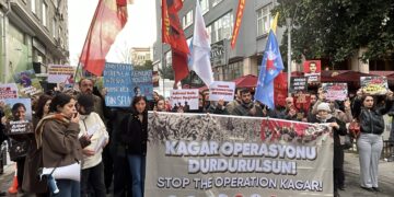 At a protest held in front of the Consulate of India in Istanbul, the slogans “Stop Operation Kagar! End the Massacres!” were raised. Upon the call of Partizan, Alınteri, Devrimci Hareket, Ezilenlerin Sosyalist Partisi, Kaldıraç, Komün, Mücadele Birliği, Sosyalist Meclisler Federasyonu and Sosyalist Mücadele İnisiyatifi, participants gathered in front of the consulate building located in … “Stop Operation Kagar! End the Massacres!” okumayı sürdür