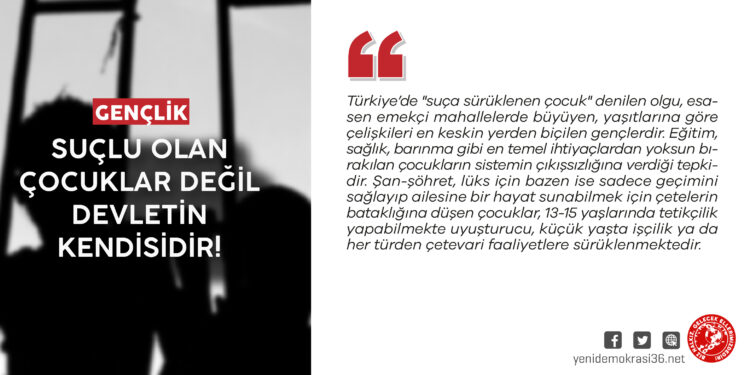 Kapitalist-emperyalist düzenin derinleşen kriz koşullarında, sistemin en çok görünür kıldığı emekçi halkın çocukları, aynı zamanda toplumun en fazla ezilen kesimidir. Sınıfsal ve ulusal çelişkinin öznesi olan genç kitleler, sorunun tam ortasındadır. “Suça sürüklenen çocuk” kavramı burjuvazinin ideolojik aygıtları tarafından bilinçli biçimde üretilmiştir. Yoksulluğun, işsizliğin, geleceksizliğin doğrudan sonucu olan toplumsal çürümenin faturasını gençliğe kesmek; egemen sınıfların mevcut çıkarlarını derinleştirmek ve daha fazla çıkar sağlamak amacıyla başvurulan yöntemlerden biridir. Egemenler, kendi yarattığı kriz ve yoksulluğun ürününü “suç” kavramı altında kriminalize ederek kitlelerin gözünde meşrulaştırmaya çalışır.