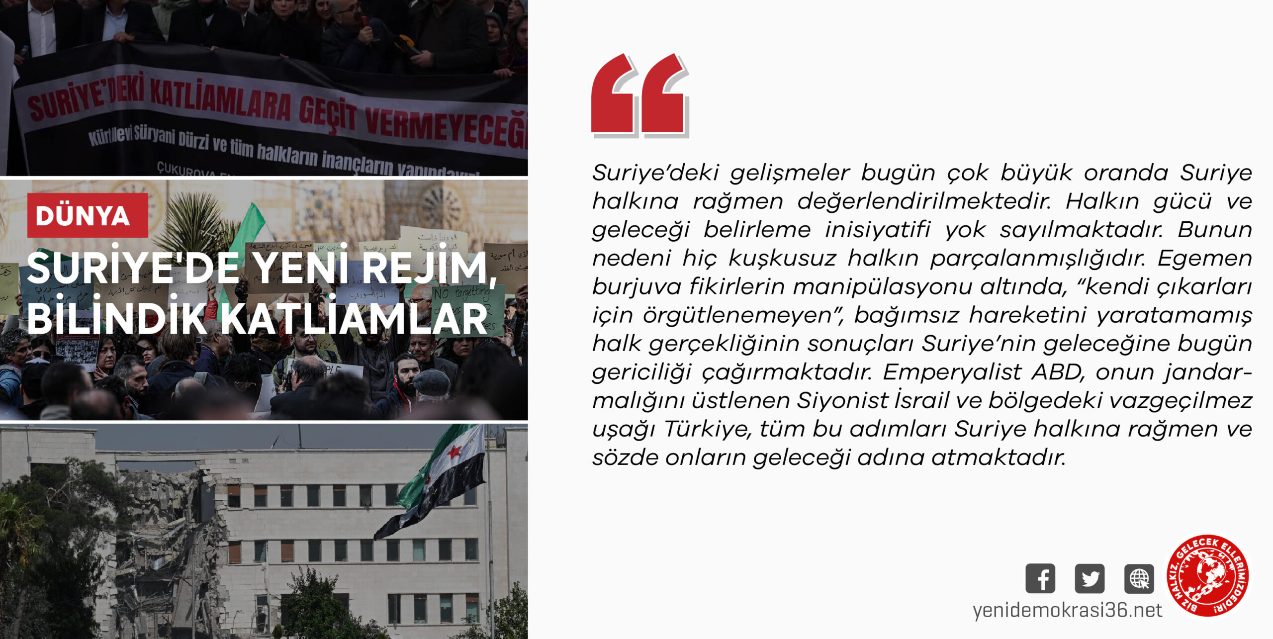 Emperyalistlerin perde arkası anlaşmalarıyla Rusya’nın 8 Aralık 2024 tarihinden itibaren çekildiği Suriye’de (Tartus Deniz Üssü hariç), özellikle de ülkenin batısında İsrail’in ve öteden beri inşa ettiği cihatçı ağıyla TC’nin kontrolü arttı. Esad rejiminin devrilmesi ve yönetimin Colani’ye devredilmesinin ardından, başta korumasız ve savunmasız Aleviler olmak üzere Suriye’nin bütün ezilen inanç, dışlanan mezheplerinden kitlelere ve ezilen uluslara saldırıların artması bize bir halkın, geleceğini ancak kendisinin kurabileceğini göstermiştir.