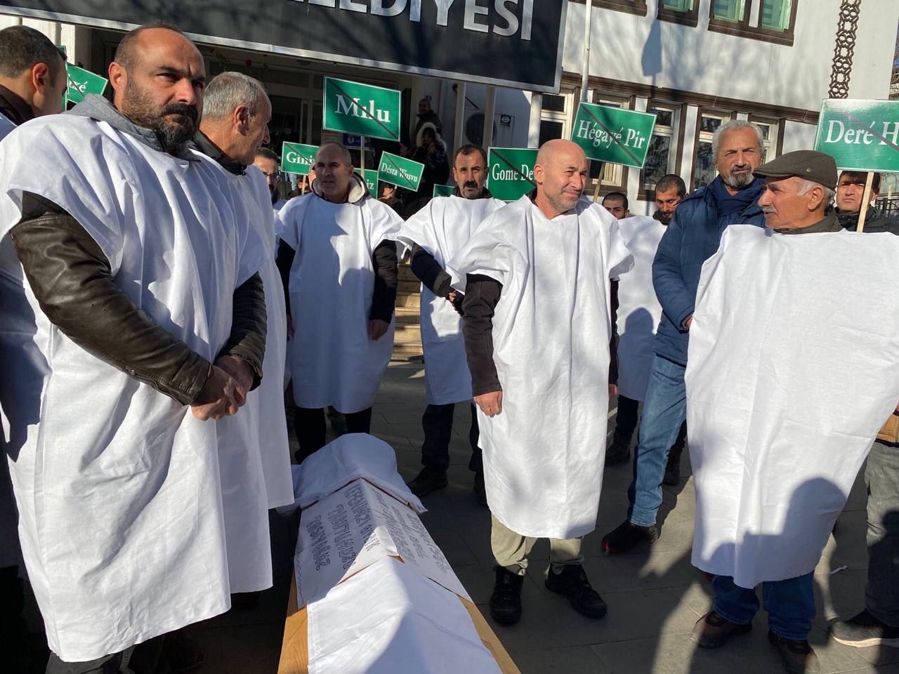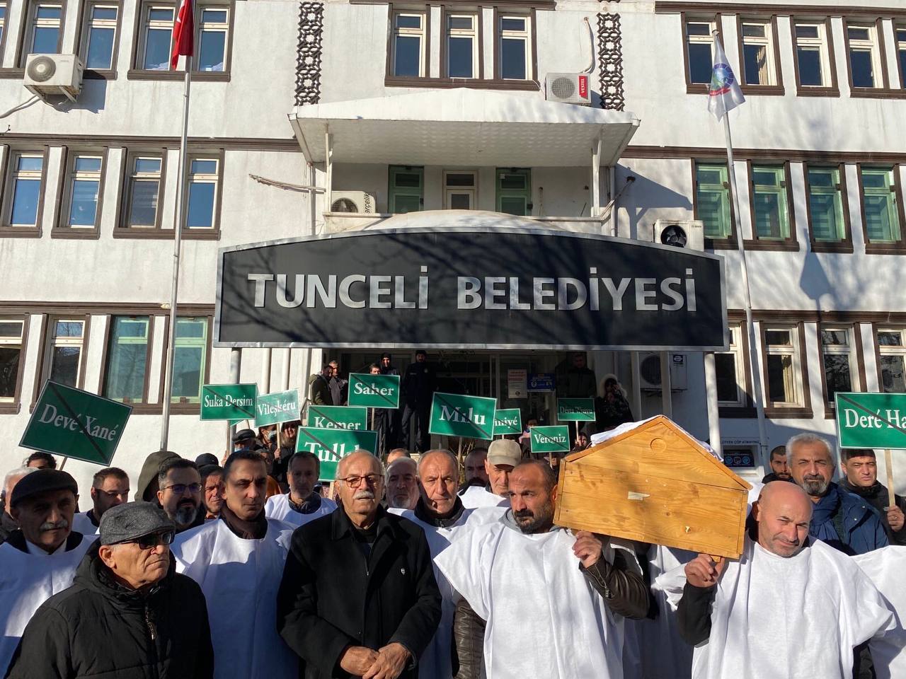 Sanat Sokağı’nda kefenleriyle ve tabutla bir araya gelen köylüler Dersim Belediyesi önüne yürüyüş gerçekleştirdi. Alkış ve ıslıklar eşliğinde gerçekleştirilen yürüyüşte belediye önüne tabut bırakıldı.