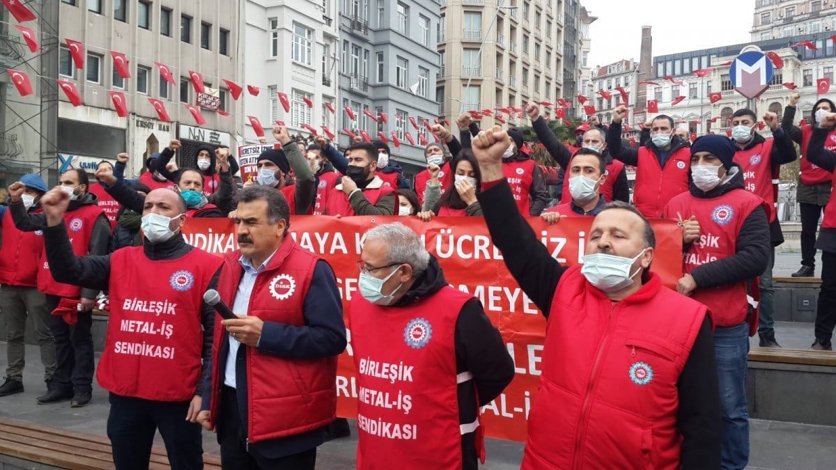 HABER MERKEZİ- Ücretsiz izin saldırısına uğrayan Birleşik Metal-İş üyesi Systemair HSK işçileri, Şişhane Meydanı’nda basın açıklaması yaptı.