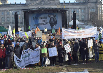 Berlin'de Federal Meclis Binası önünde toplanan binlerce çiftçi, tarım arazileri ve çiftliklerin tekellere devredilmesi, küçük üreticilerin ürettiğini maliyetinin çok altında ...