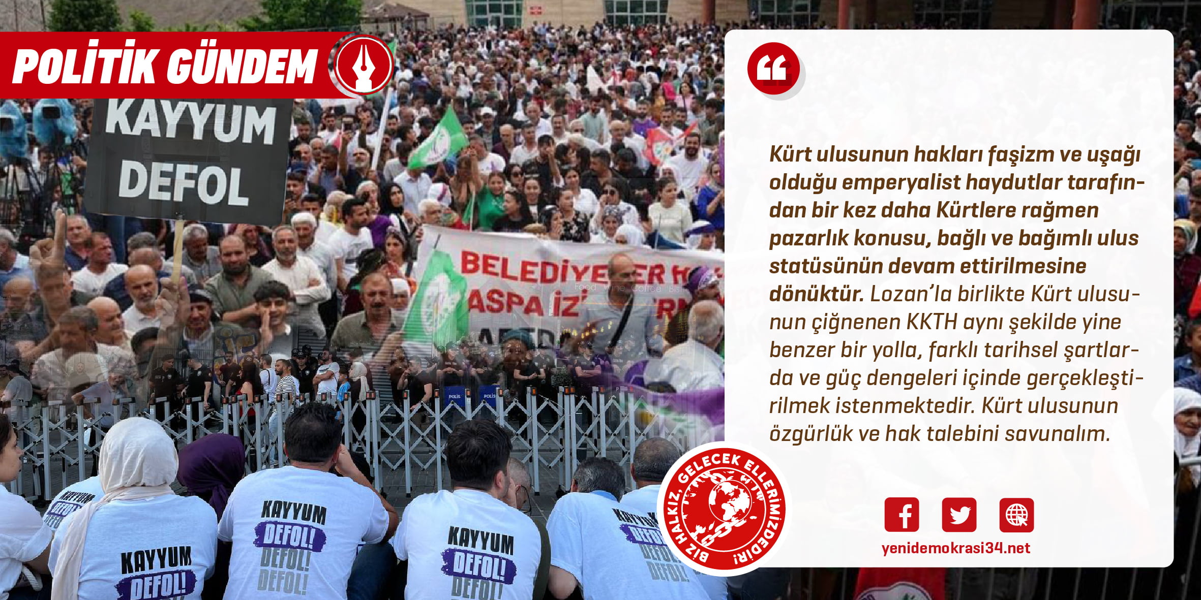 Yeni Demokrasi; işçi sınıfı ve emekçilerin, ezilen ulus ve milliyetlerin, geleceksiz bırakılan gençliğin, devrimci tutsakların ve devrimci basının sesidir.