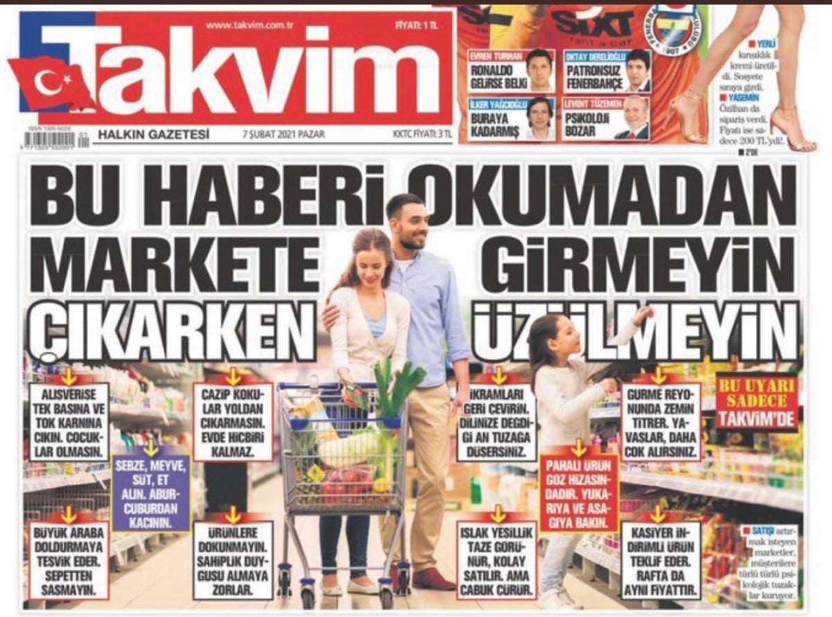 HABER MERKEZİ- Burjuva-feodal medyanın kalemşörlerinden Takvim gazetesinin manşete taşıdığı ‘market’ haberi sosyal medyada büyük tepki gördü. “Bu haberi okumadan markete girmeyin. Çıkarken üzülmeyin” başlığı ile “market ipuçları” sıralayan gazete raflardaki pahalılığın asıl sebebini göstermemekle eleştirildi.