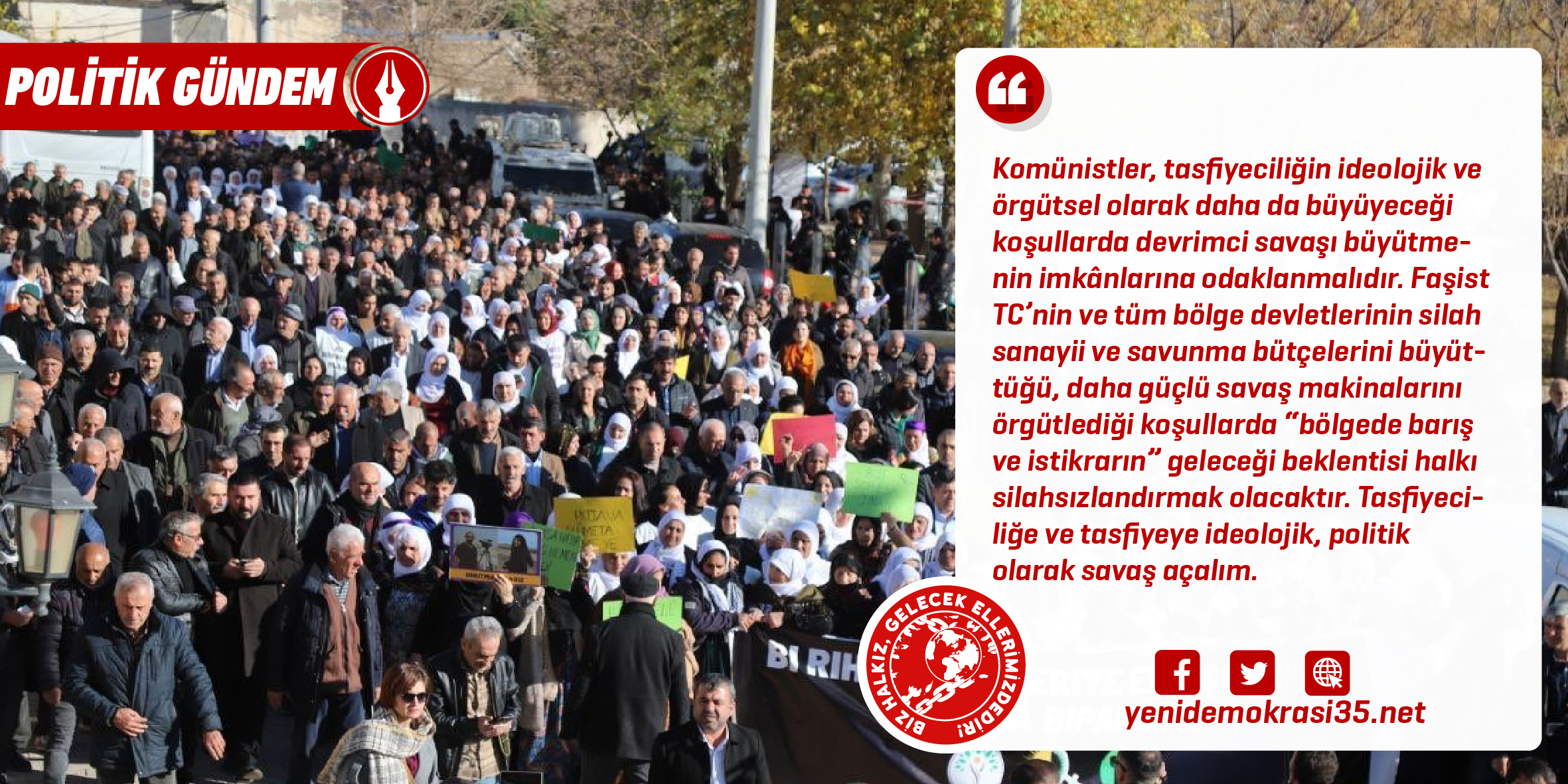 Komünistler, tasfiyeciliğin ideolojik ve örgütsel olarak daha da büyüyeceği koşullarda devrimci savaşı büyütmenin imkânlarına odaklanmalıdır. Faşist TC’nin ve tüm bölge devletlerinin silah sanayii ve savunma bütçelerini büyüttüğü, daha güçlü savaş makinalarını örgütlediği koşullarda “bölgede barış ve istikrarın” geleceği beklentisi halkı silahsızlandırmak olacaktır. Tasfiyeciliğe ve tasfiyeye ideolojik, politik olarak savaş açalım. Türk halkının Kürt düşmanlığı ile zehirlenmesine ve Kürt ulusunun kaderini belirlemesinin elinden alınmasına karşı “devlet kurma hakkını” ve tam hak eşitliğini savunalım, bu eşitliğin savaşımını verelim.