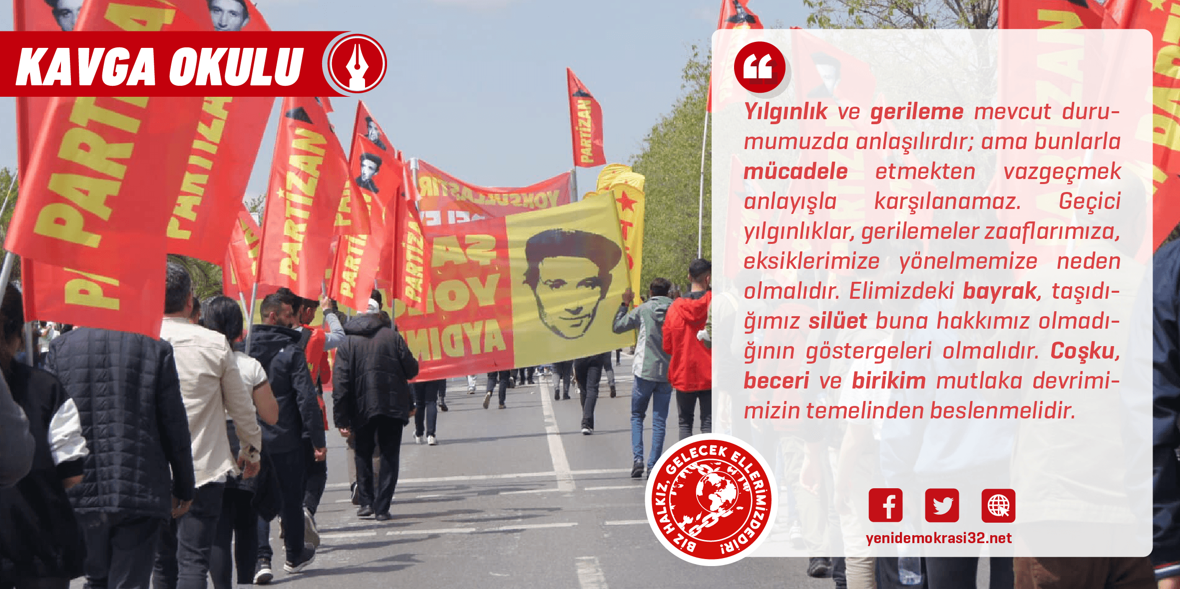 Yılgınlık ve gerileme mevcut durumumuzda anlaşılırdır; ama bunlarla mücadele etmekten vazgeçmek anlayışla karşılanamaz. Geçici yılgınlıklar, gerilemeler zaaflarımıza, eksiklerimize yönelmemize neden olmalıdır. Elimizdeki bayrak, taşıdığımız silüet buna hakkımız olmadığının göstergeleri olmalıdır. Coşku, beceri ve birikim mutlaka ama mutlaka devrimimizin temelinden beslenmelidir. Görevimiz devrimimizin temellerinden beslenmek, bunlara dayanmak ve düşmanı alt edecek gücün coşkusunu, becerisini, birikimini kazanmaktır. Lenin yoldaşın işaret ettiği strateji ve taktik ustalığa bu yolla ulaşabiliriz…