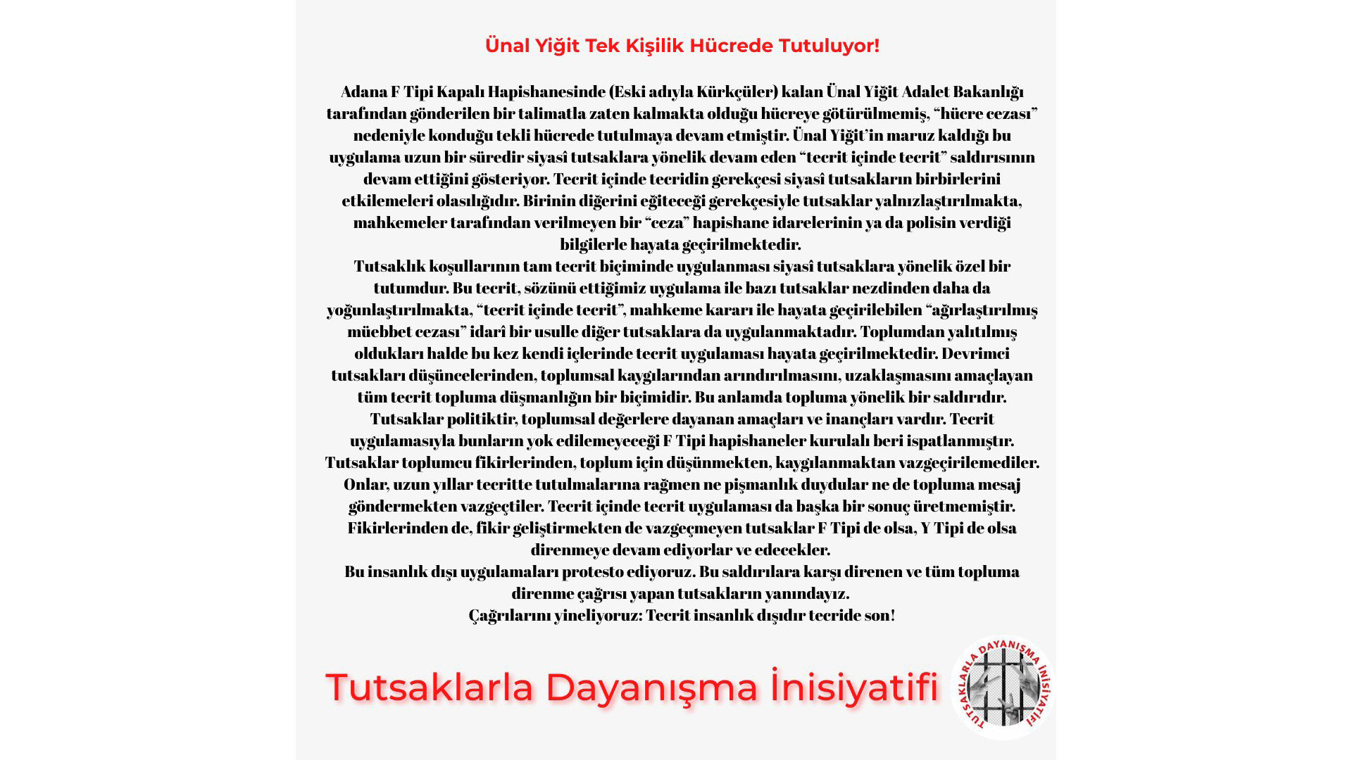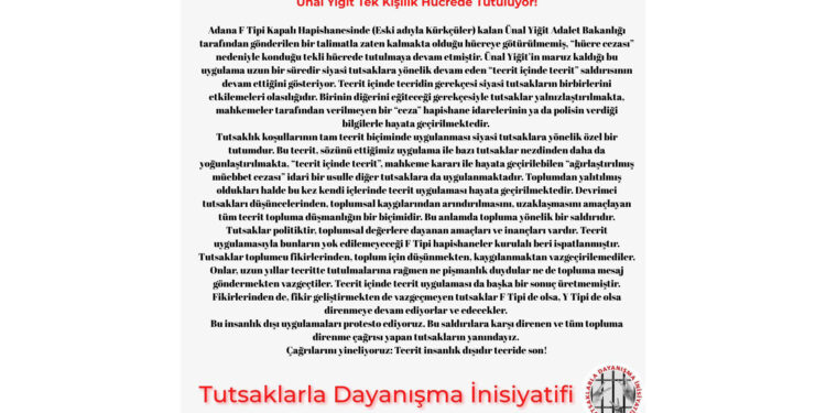 Tutsaklarla Dayanışma İnisiyatifi (TDİ) Tutsak Partizan Ünal Yiğit’in tek kişilik hücrede tutulmasına ilişkin bir açıklama yaptı.