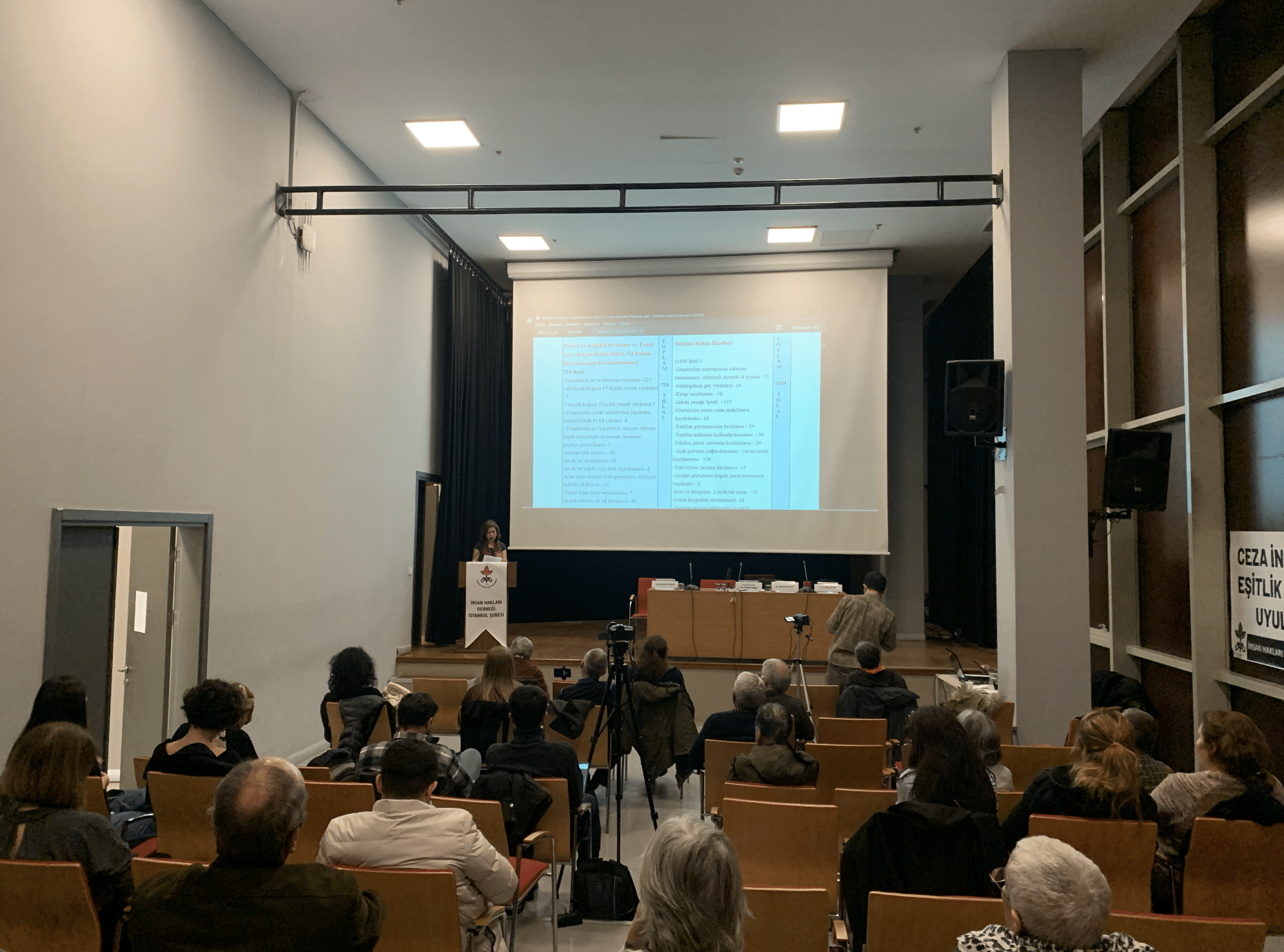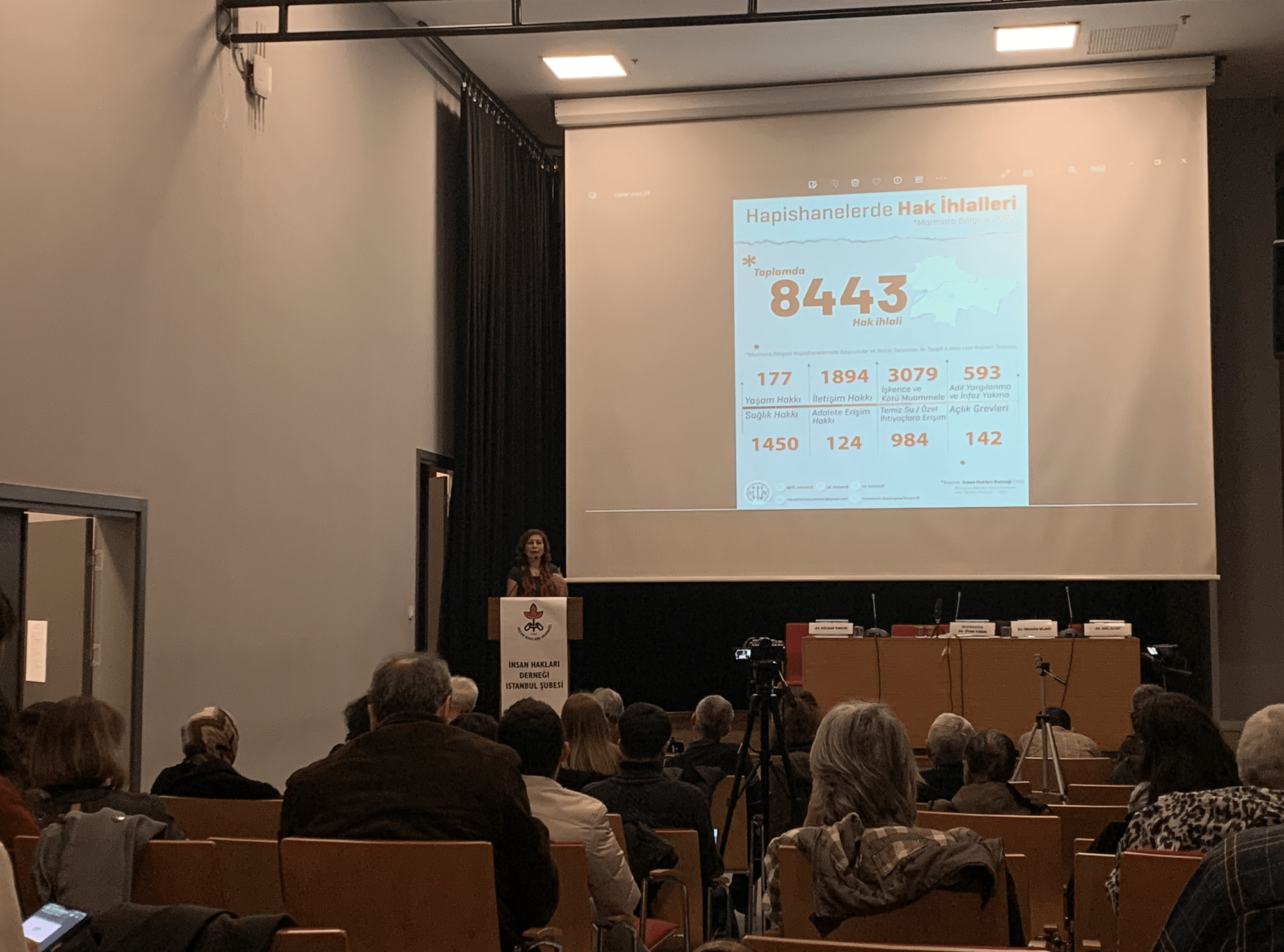 Oturum öncesi konuşan İHD İstanbul Şubesi Başkanı Gülseren Yoleri, Marmara Bölgesi’ndeki hapishanelerde tespit ettikleri ihlallere dair hazırladıkları 2022 yıllı raporunu hatırlatarak tutsaklara yönelik hak ihlallerinin günden güne arttığını söyledi. Hapishanelerde yaşam hakkı başta olmak üzere pek çok ihlalin söz konusu olduğunu belirten Yoleri, işkence ve kötü muamele bağlamında yaşanan ihlallere dikkat çekti. Bu alanda yıl içerisinde en az 3 bin ihlalin yaşandığını kaydeden Yoleri, ayrıca iletişim alanında yaşanan ihlallere değinerek tutsakların yaşamdan tecrit edildiğini belirtti.