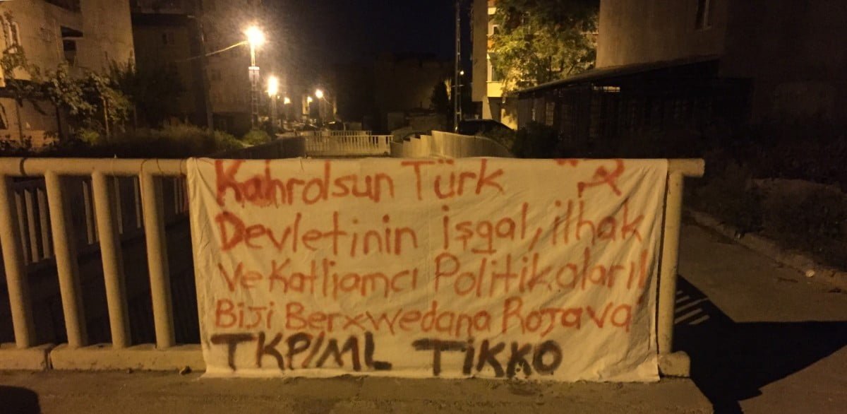 HABER MERKEZİ- TC devletinin Suriye’nin kuzey ve doğusuna yönelik ÖSO çeteleri ile birlikte başlattığı işgal ve katliam saldırılarına karşı TKP/ML militanları tarafından Esenyurt’ta pankart asıldı. Elimize e-posta yoluyla ulaşan habere göre; “Kahrolsun Türk Devletinin, İşgal, İlhak ve Katliamcı Politikaları, Biji Berxwedana Rojava” şiarlı pankart asan militanların açıklaması şu şekilde;