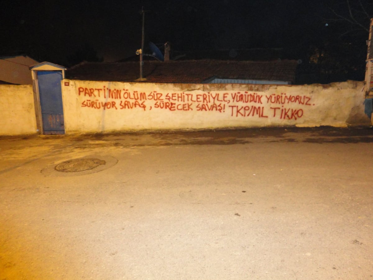 HABER MERKEZİ- Elimize e-posta yoluyla ulaşan habere göre TKP/ML (Türkiye Komünist Partisi/Marksist Leninist) militanları İstanbul Gazi Mahallesi’nde yazılama yaparak 30 Ekim-9 Kasım tarihleri arasında Dersim Aliboğazı’nda ölümsüzleşen TİKKO komutanı Cumhur Sinan Oktulmuş’u (Deniz) andı.