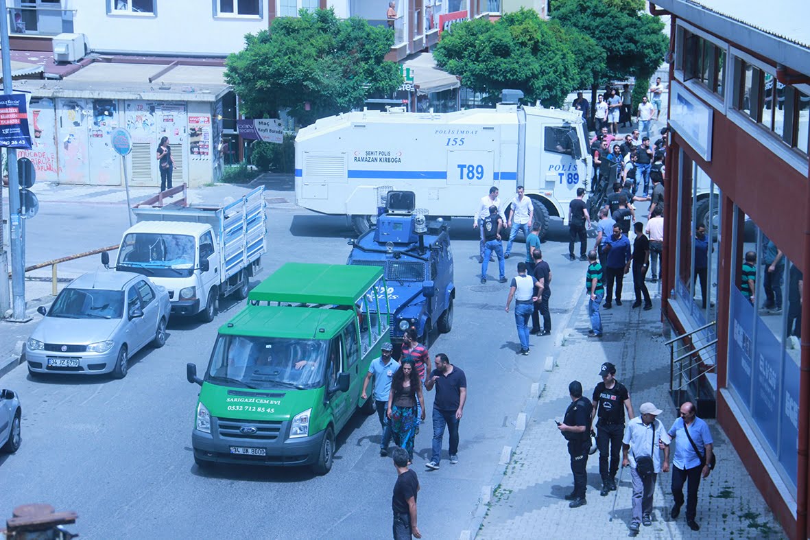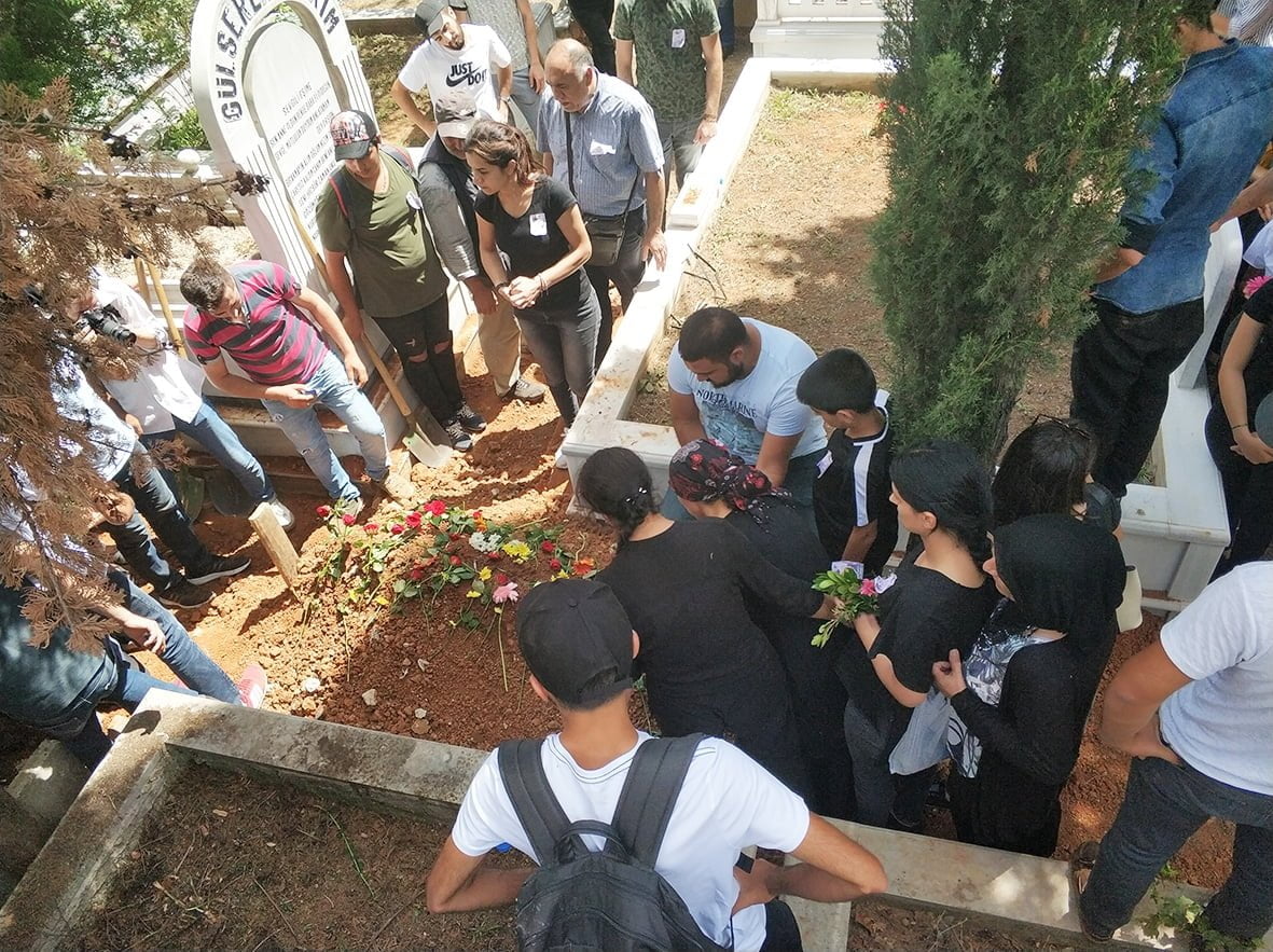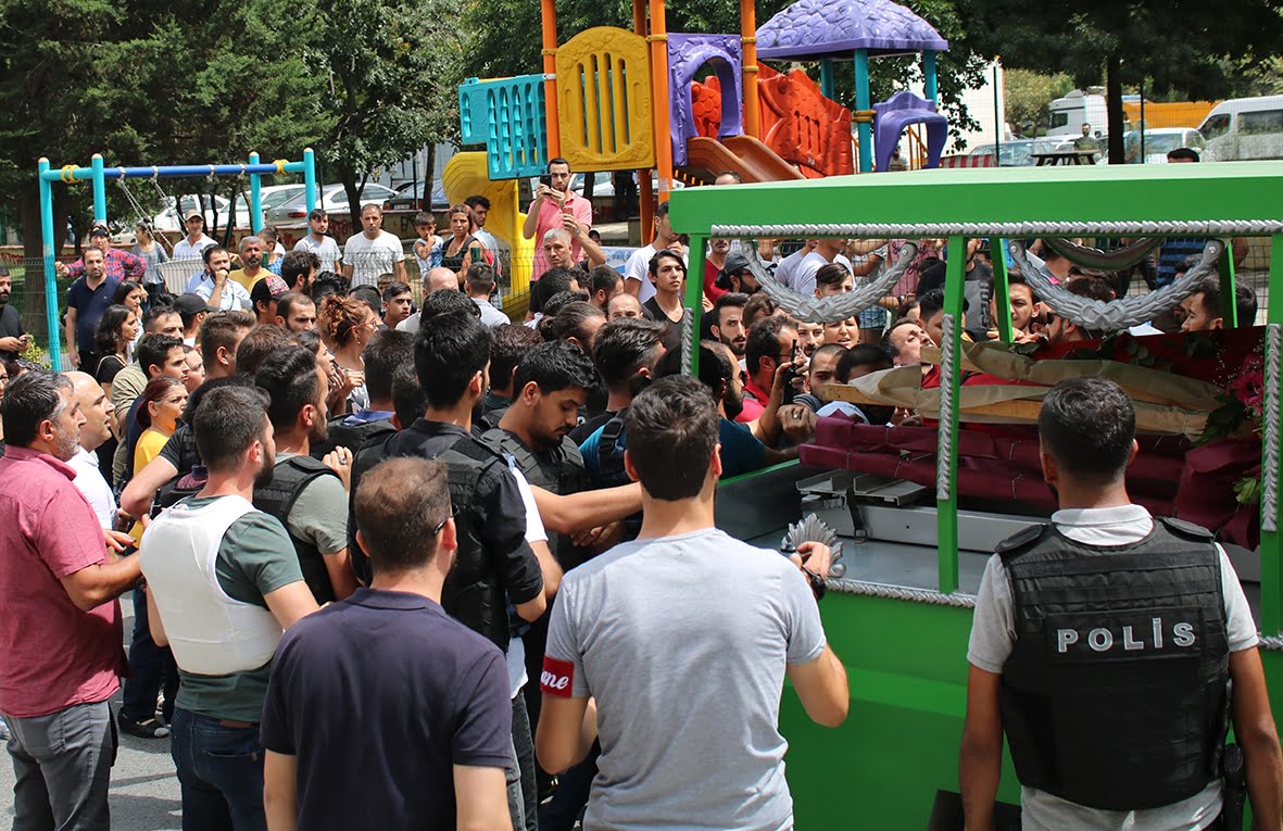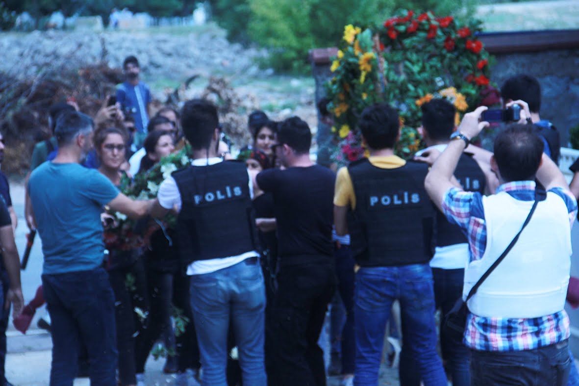 Devamında cenaze aracına yetişmeye çalışan kitleye “Bu cenaze terörist cenazesi” diye sürekli taciz eden polise kitlenin içerisinden “terörist değil devrimci” cevabı verildi. Tüm baskı, saldırı ve tacizlere rağmen yürüyen kitle mezarlığa yaklaştığına, mezarlık girişini tutan polis bu defa önde yürüyen ailelerin taşıdığı, PŞTA, Partizan ve Halk Cephesi çelenklerine karşı saldırıya geçti ve çelenklerin üzerindeki yazıları sökerek parçaladı. Polisin saldırısının ardından kitle “Gerillalar ölmez yaşasın halk savaşı” sloganlarıyla mezarlığa giriş yaptı.