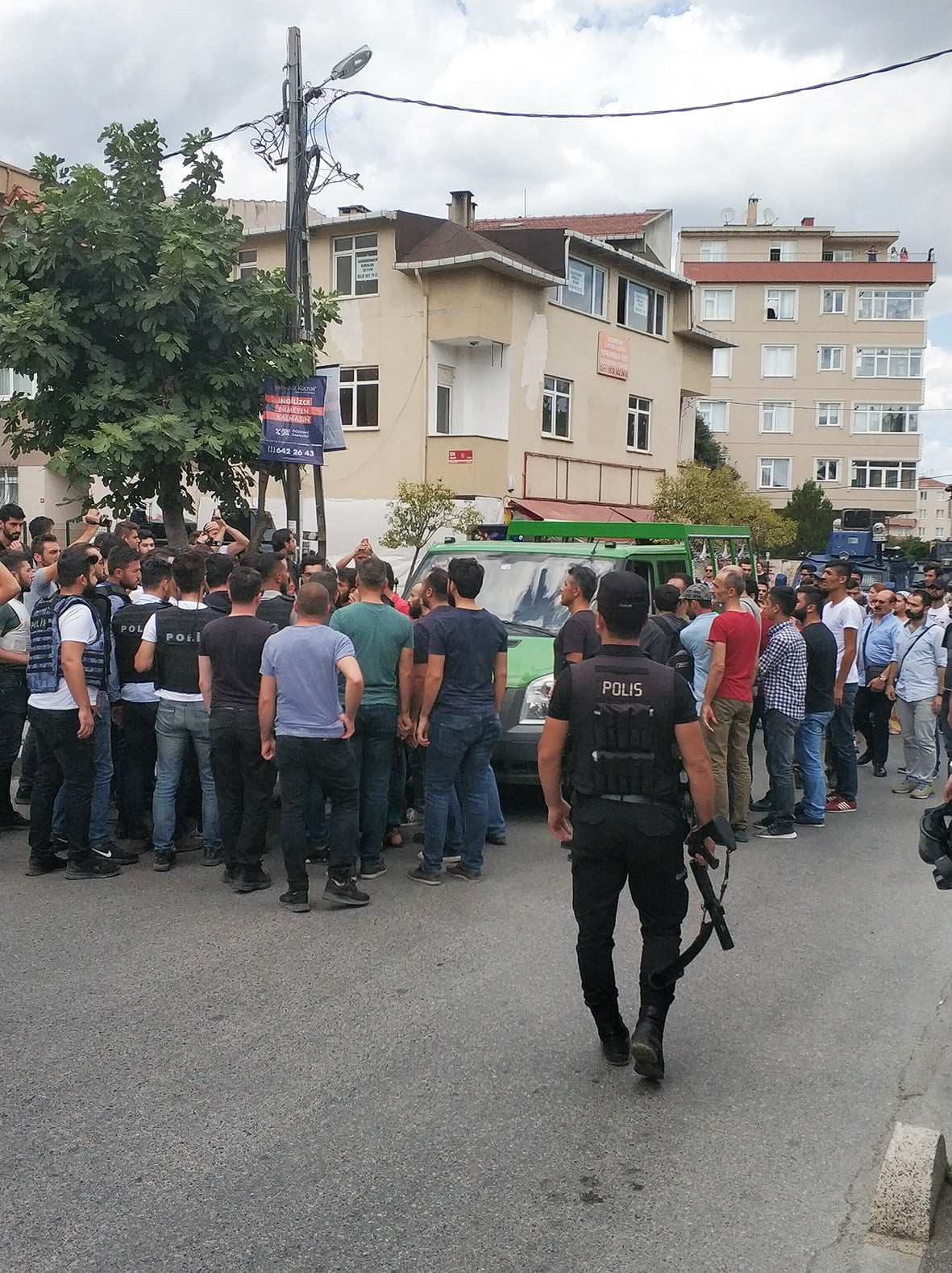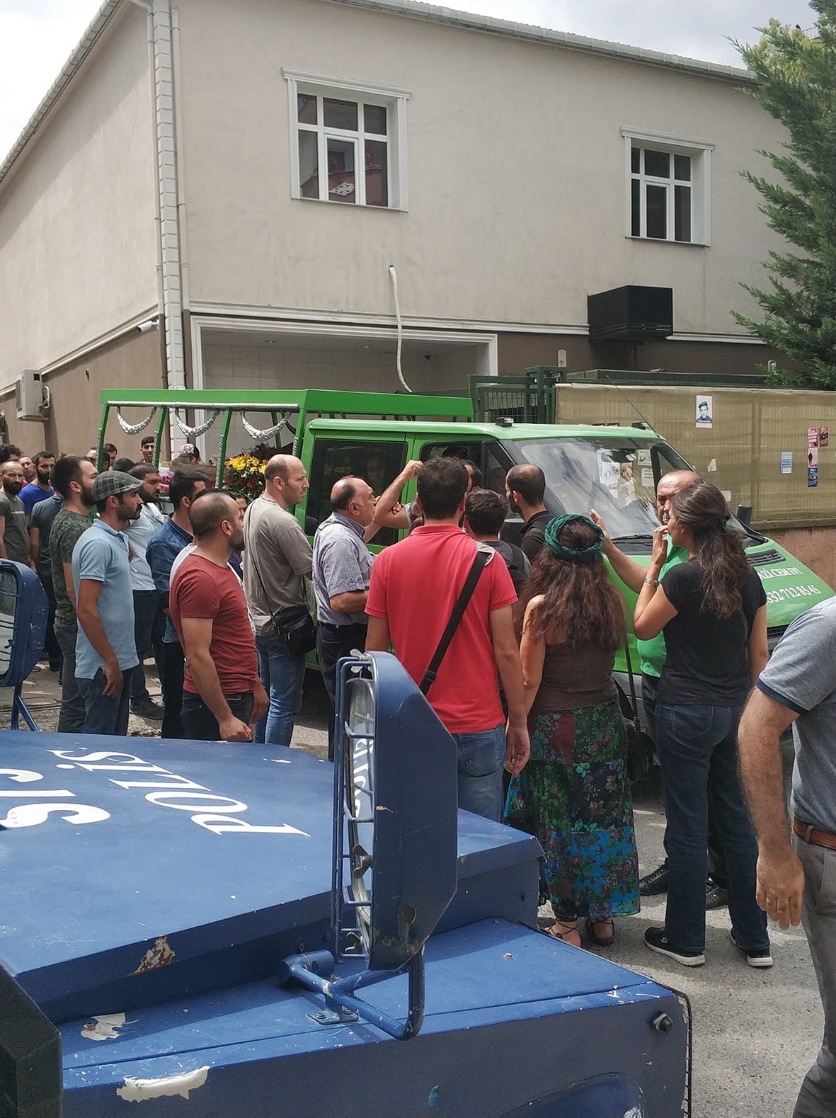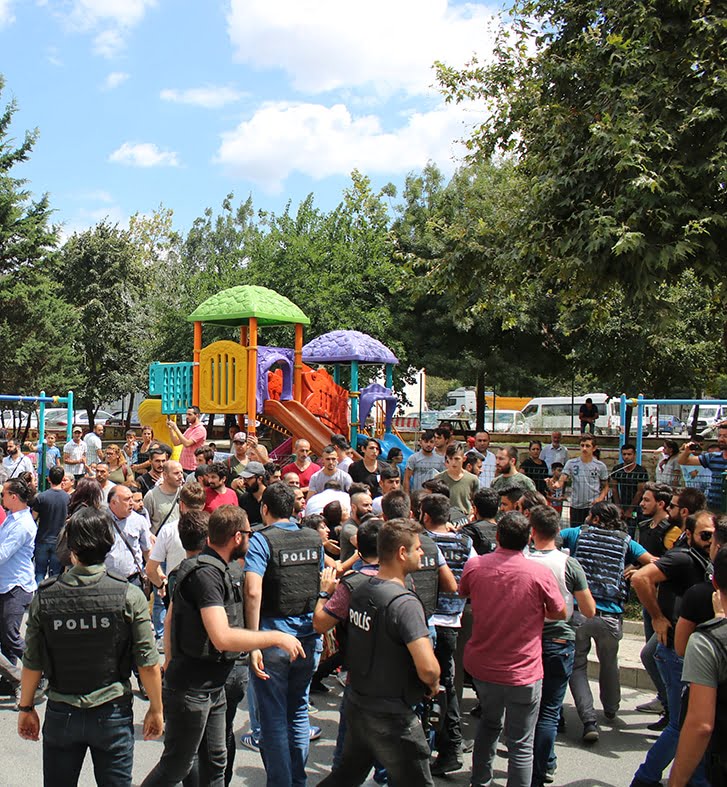 Devamında cenaze aracına yetişmeye çalışan kitleye “Bu cenaze terörist cenazesi” diye sürekli taciz eden polise kitlenin içerisinden “terörist değil devrimci” cevabı verildi. Tüm baskı, saldırı ve tacizlere rağmen yürüyen kitle mezarlığa yaklaştığına, mezarlık girişini tutan polis bu defa önde yürüyen ailelerin taşıdığı, PŞTA, Partizan ve Halk Cephesi çelenklerine karşı saldırıya geçti ve çelenklerin üzerindeki yazıları sökerek parçaladı. Polisin saldırısının ardından kitle “Gerillalar ölmez yaşasın halk savaşı” sloganlarıyla mezarlığa giriş yaptı.