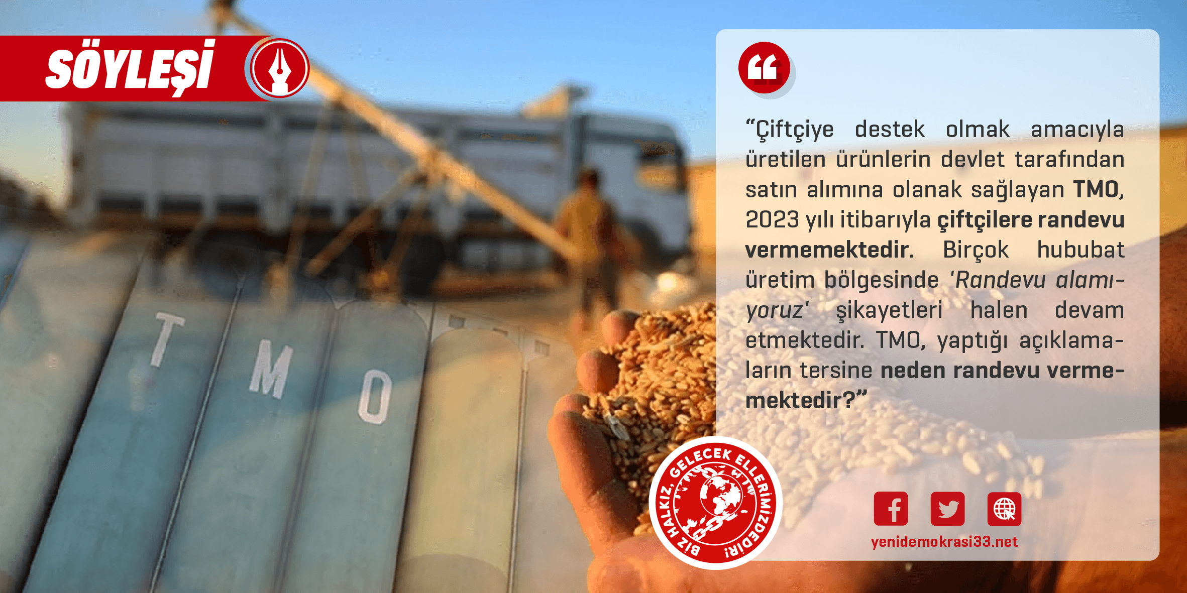 “TMO açıkladığı alım uygulamalarında ÇKS kayıtlı çiftçiye alım garantisi vermiştir. Fakat randevu vermeyerek hububat çiftçisi nezdinde güven kaybı yaşanmasına neden olmaktadır.
