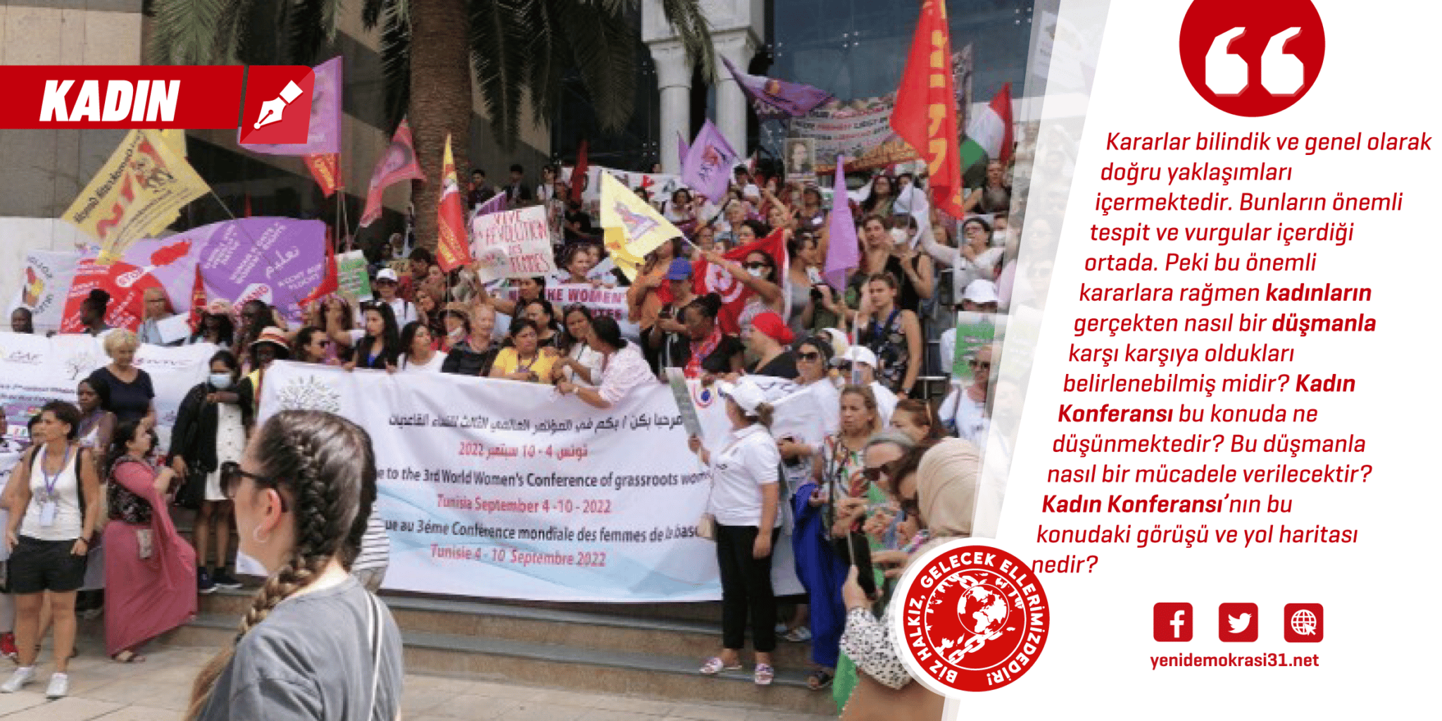 III. Dünya Kadın Konferansı 3-9 Eylül tarihleri arasında Tunus’ta gerçekleştirilmişti. Konferansı kadın mücadelesi için önemli gördüğümüzü ve gündemlerine ilişkin tartışmalar yürüteceğimizi söylemiştik. Bu tartışmaların Tunus III. Dünya Kadın Konferansı aracılığıyla kadınların kurtuluşuna giden yola dair çok köklü ideolojik tartışmaları alevlendirmeye vesile olmasını istiyoruz. Bu bağlamda öncelikle konferansın programını anlamaya çalıştık. Nasıl örgütlendiğini, hazırlık sürecinin nasıl oluşturulduğunu, konferansa katılım kriterlerinin neler olduğunu inceledik. Gördük ki tamamında tartışmaya muhtaç yanlar var. Bununla birlikte Tunus’ta bir araya gelen 42 ülkeden 93 delege, 450 katılımcının ve 52 örgütün nasıl bir program etrafında bir araya geldiğine ilişkin bir araştırmaya girdik. Doğrusunu söylemek gerekirse “konferans programı” diyebileceğimiz nitelikte bir dokümanın olmadığını gördük. Bu, hazırlık sürecine dair bize bir fikir vermekle birlikte konferansın niteliğine ilişkin de tartışmaya muhtaç yanların olduğunu göstermiştir. Konferans katılımcılarının nasıl oluşturulduğu da bir diğer önemli konudur. Konferansa katılan örgütlerin yayımlamış olduğu haberlerden konferansa birçok “Marksist-Leninist”, yurtsever ve feministler başta olmak üzere işçiler, sosyalist feministler, örgütlü ve örgütsüz kadınlar, tarım işçileri, genç kadınlar, LGBTİ+- lardan oluşan çok geniş bir bileşenin katılmış olduğunu öğrendik.