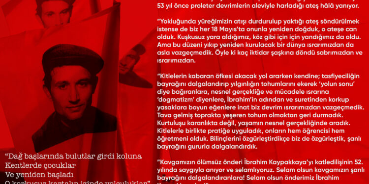 “53 yıl önce proleter devrimlerin aleviyle harladığı ateş hâlâ yanıyor. (…) Biz her 18 Mayıs’ta onunla yeniden doğduk, o ateşe can olduk.” denilen açıklamada Komünist Önder İbrahim Kaypakkaya’yı andı.