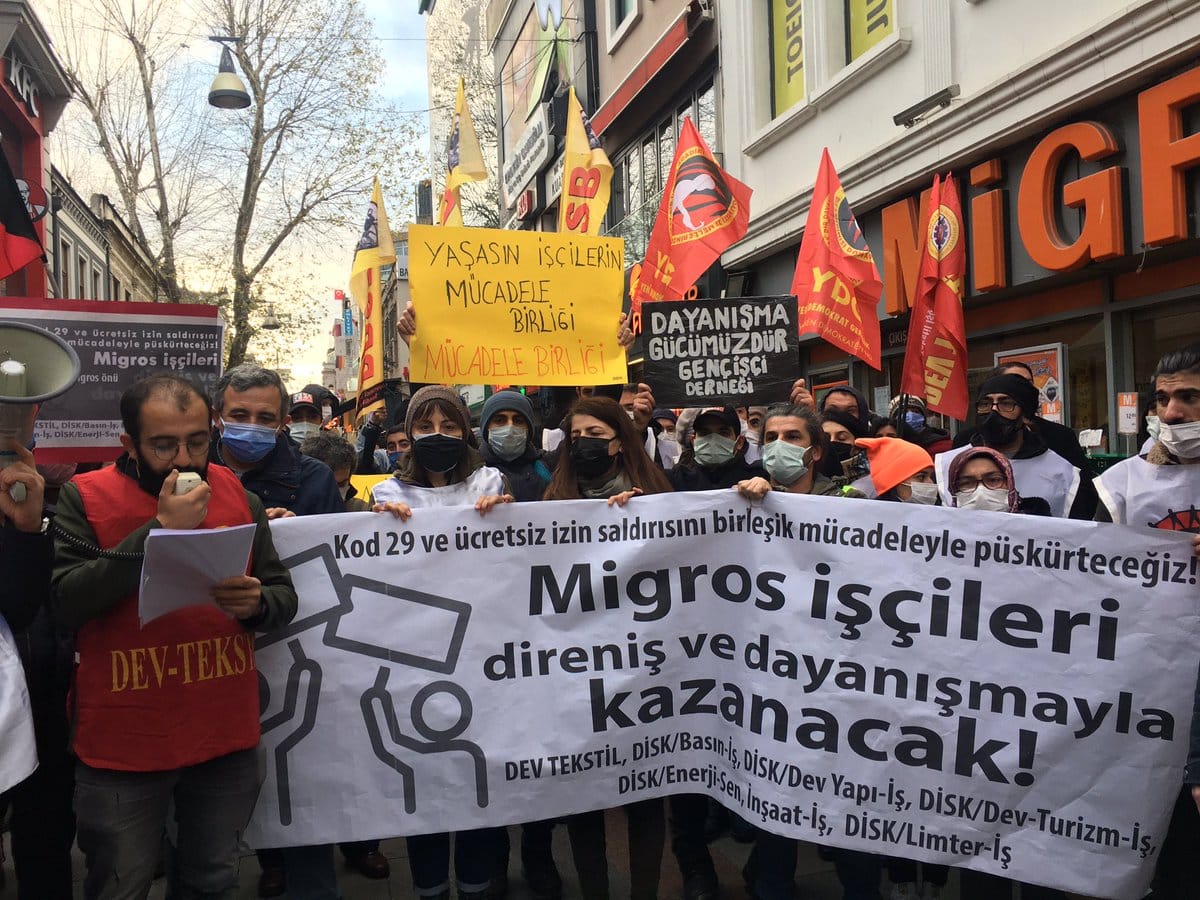 Günde 16 saate varan ağır çalışma koşullarının düzeltilmesi, işyerinde salgına karşı önlemlerin alınması, genel olarak işçi sağlığı ve iş güvenliği kurallarına uygun çalışma koşullarının sağlanması, işyerinde kadın işçilere dönük tacizin önlenmesi ve tacizcilerin işine son verilmesi gibi talepler temelinde örgütlenen 46’sı DGD-Sen üyesi 70 işçi ‘ücretsiz izne’ çıkarıldı. Hatta 3 işçi arkadaşımız Esenyurt deposuna sürgüne yollanarak fiilen işten çıkarıldı. Diğer yandan Migros Depo’da yeni işçi alımları sürmekte, sendika üyesi olduğu düşünülen işçilerden e-devletleri istenerek sendikadan istifa etmeleri yönünde baskı uygulanmakta ve ücretsiz izne çıkarılan işçiler aranıp direnmekten vazgeçtikleri takdirde tazminatlarının ödeneceği söylenmektedir.”