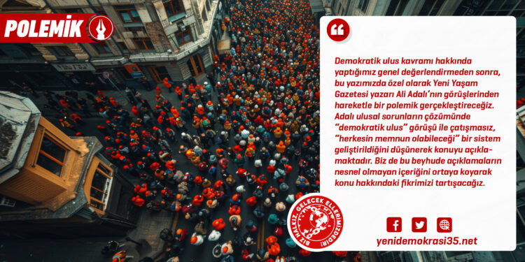 Demokratik ulus kavramı hakkında yaptığımız genel değerlendirmeden sonra, bu yazımızda özel olarak Yeni Yaşam Gazetesi yazarı Ali Adalı’nın görüşlerinden hareketle bir polemik gerçekleştireceğiz. Adalı ulusal sorunların çözümünde “demokratik ulus” görüşü ile çatışmasız, “herkesin memnun olabileceği” bir sistem geliştirildiğini düşünerek konuyu açıklamaktadır. Biz de bu beyhude açıklamaların nesnel olmayan içeriğini ortaya koyarak konu hakkındaki fikrimizi tartışacağız.